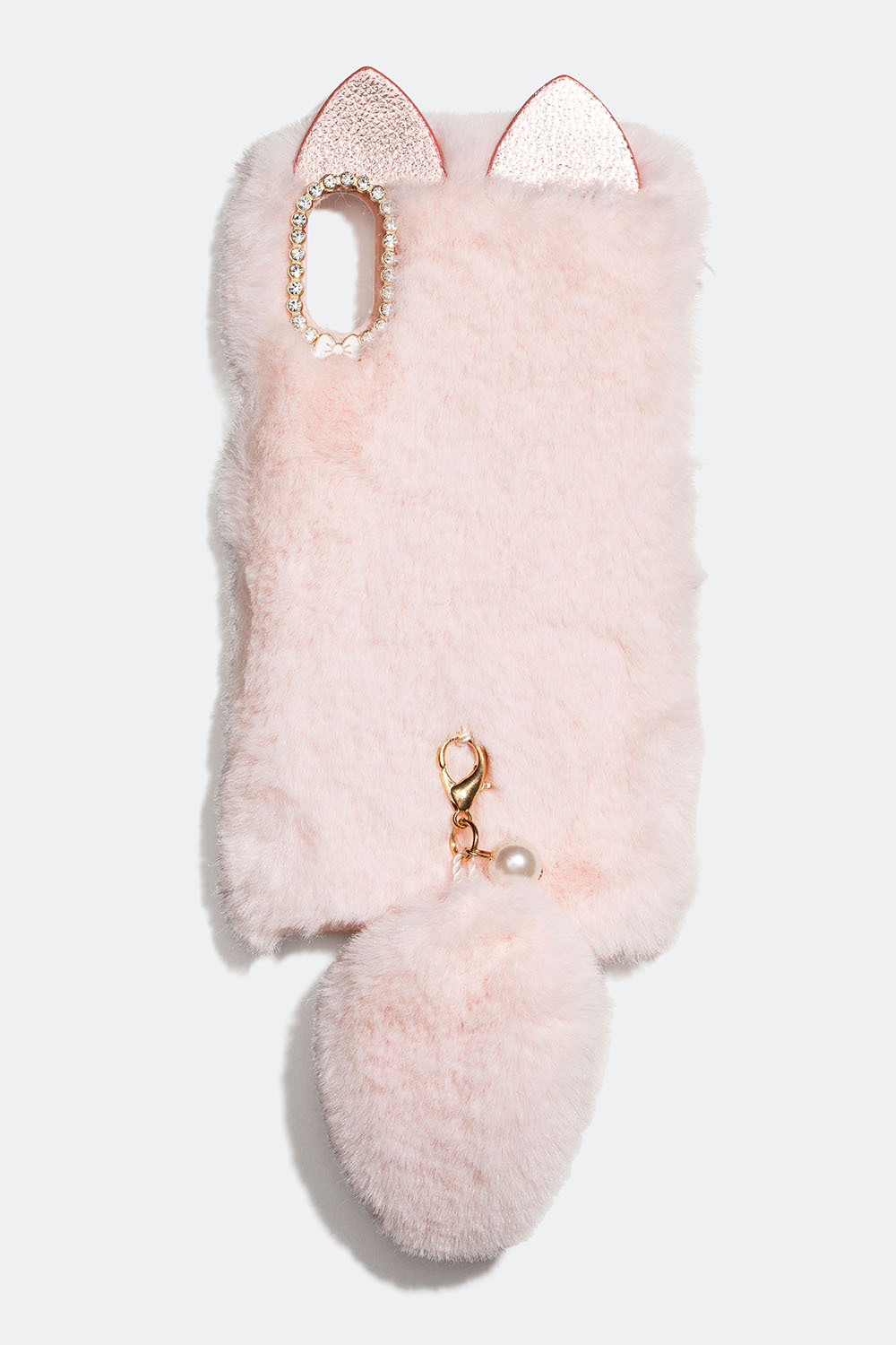 Pink mobilcover til iPhone X med ører og hale i blød imiteret pels. Mobilcoveret er lavet af plastik og dekoreret med to ører og en aftagelig hale dekoreret med en plastikperle. Mobilcoveret er desuden dekoreret med glassten og en sløjfe omkring kameralinsen.