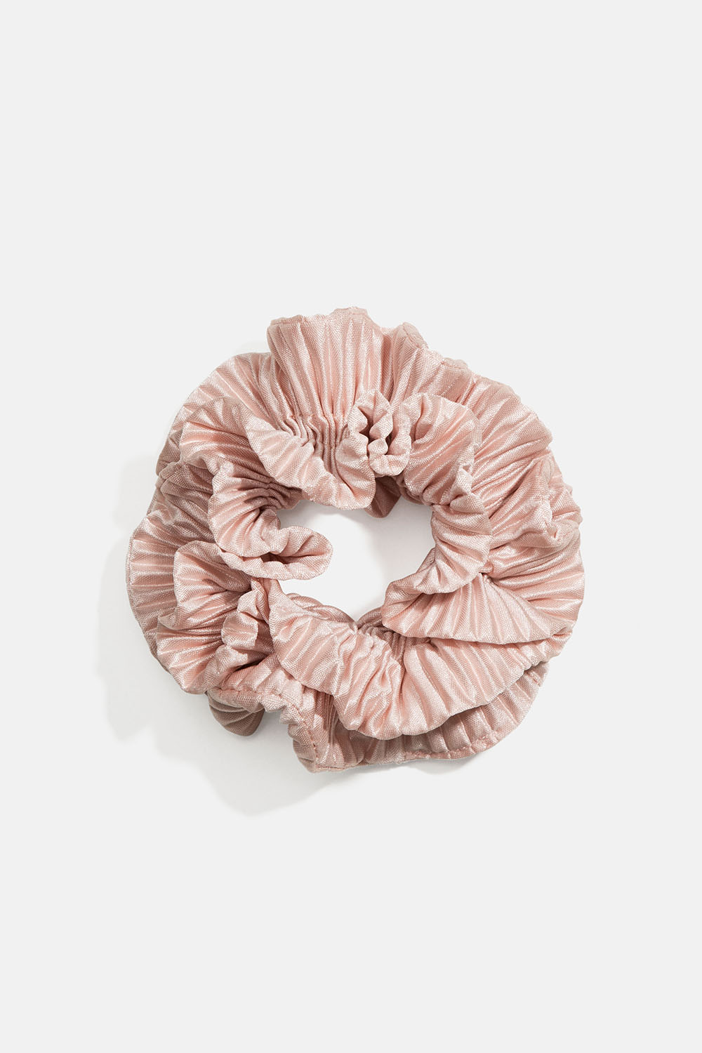 Plisseret scrunchie i rosa, blankt stof med tre dekorative volanter, der giver en skøn volumen.