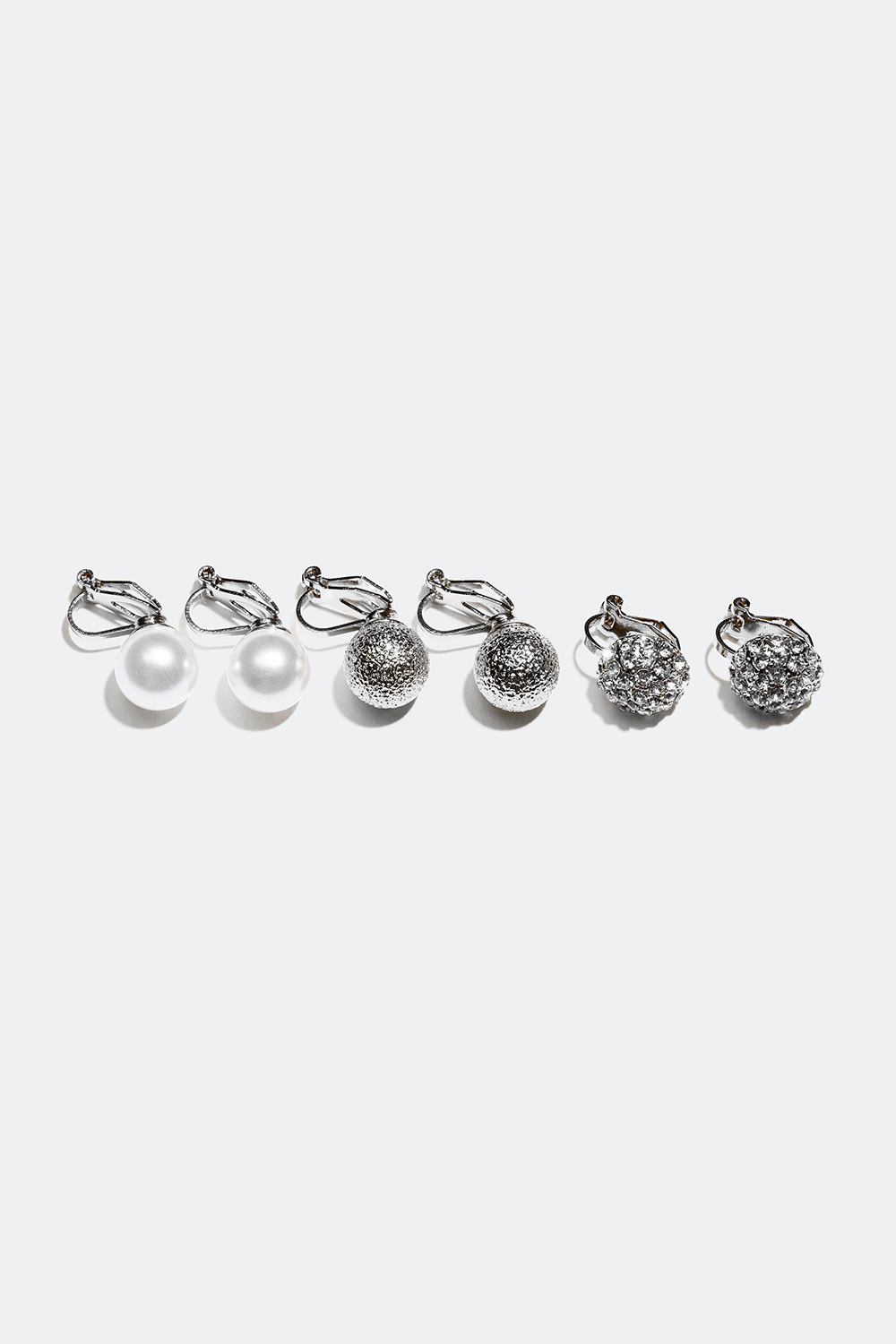 Runde clipsøreringe, 3-pack - Clipsøreringe til enhver lejlighed. Et par er dekoreret med flere små similisten i en rund form, et par er runde med en ru overflade og et par er med runde perler.