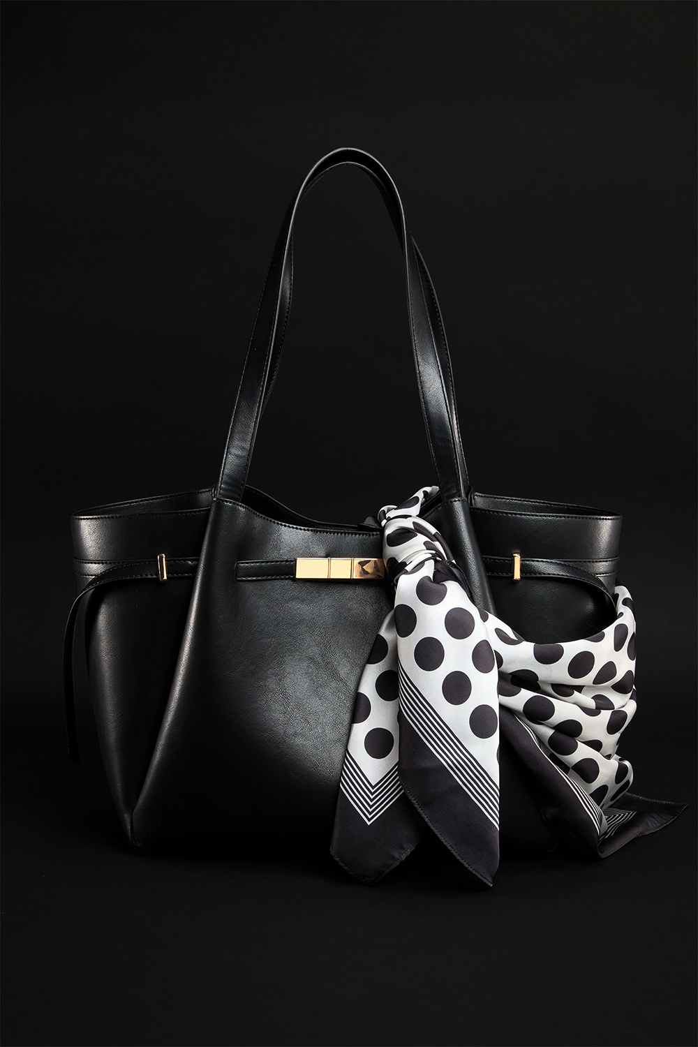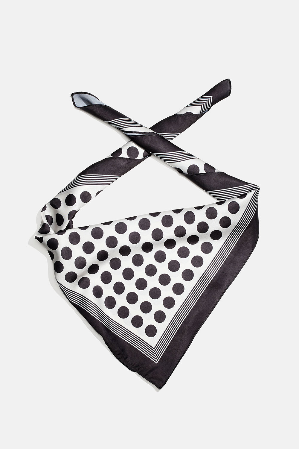 Prikket satintørklæde i sort og hvid med firkantet kant. Det kan også bruges som hårpynt eller som en ekstra detalje til tasken.
