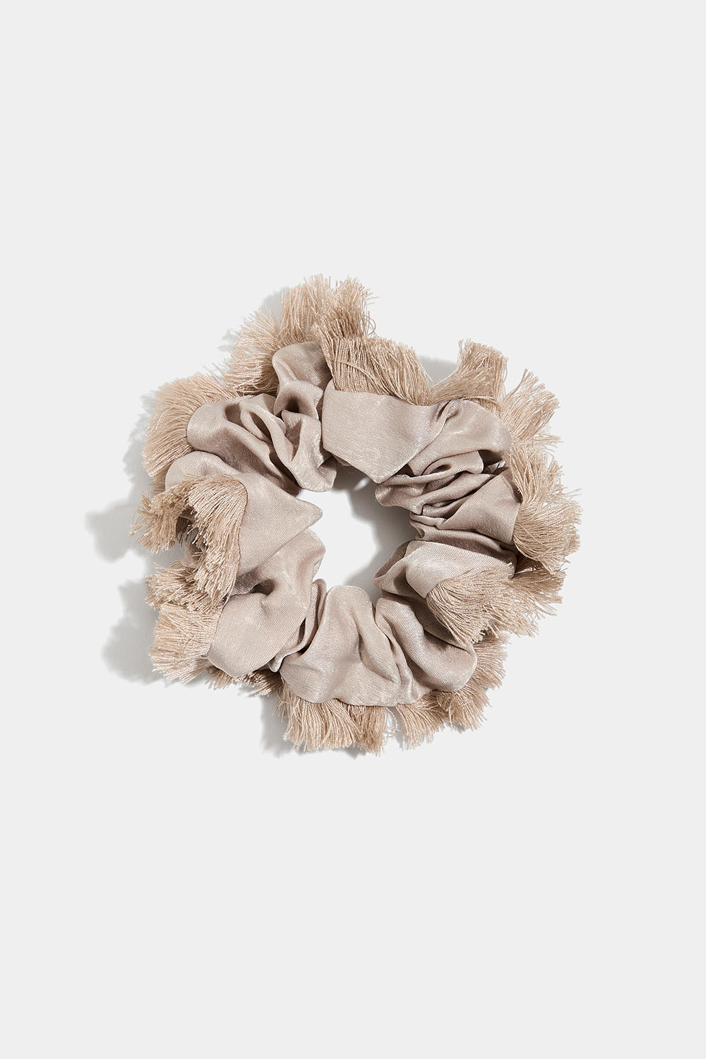 Silkeagtig scrunchie med flæsekant, beige.