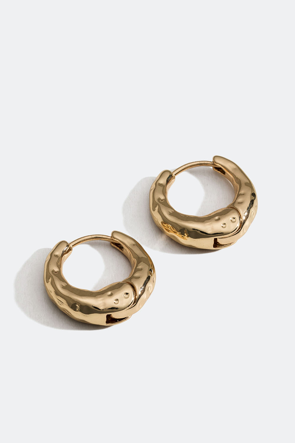 Små chunky hoops i guldfarvet metal med struktur.