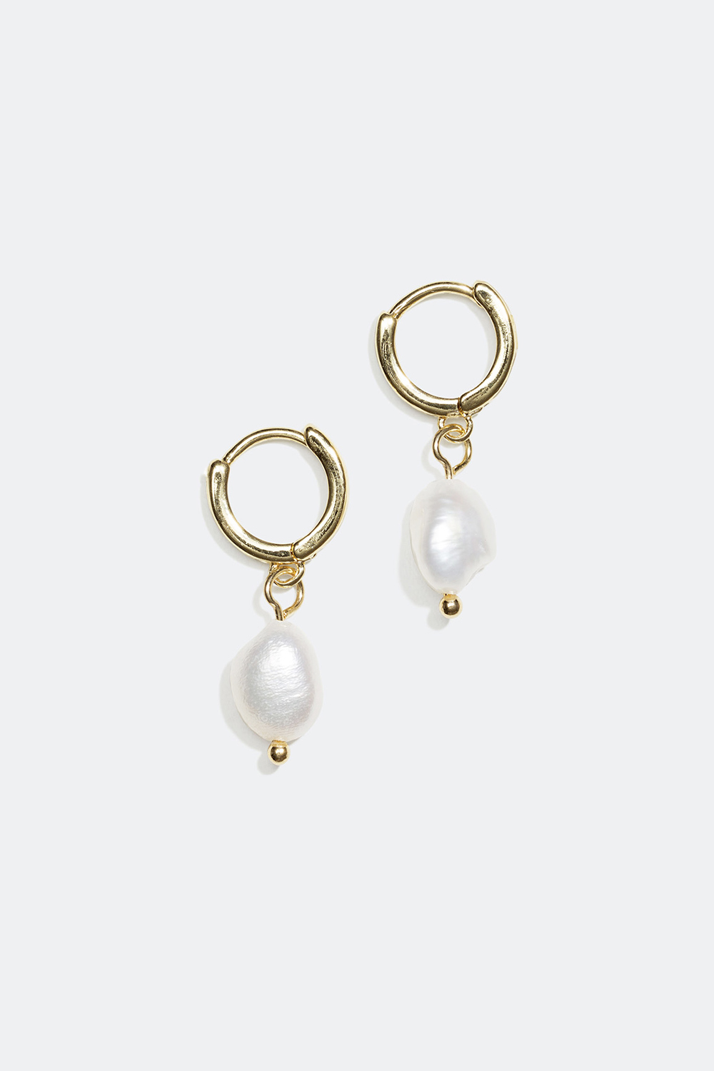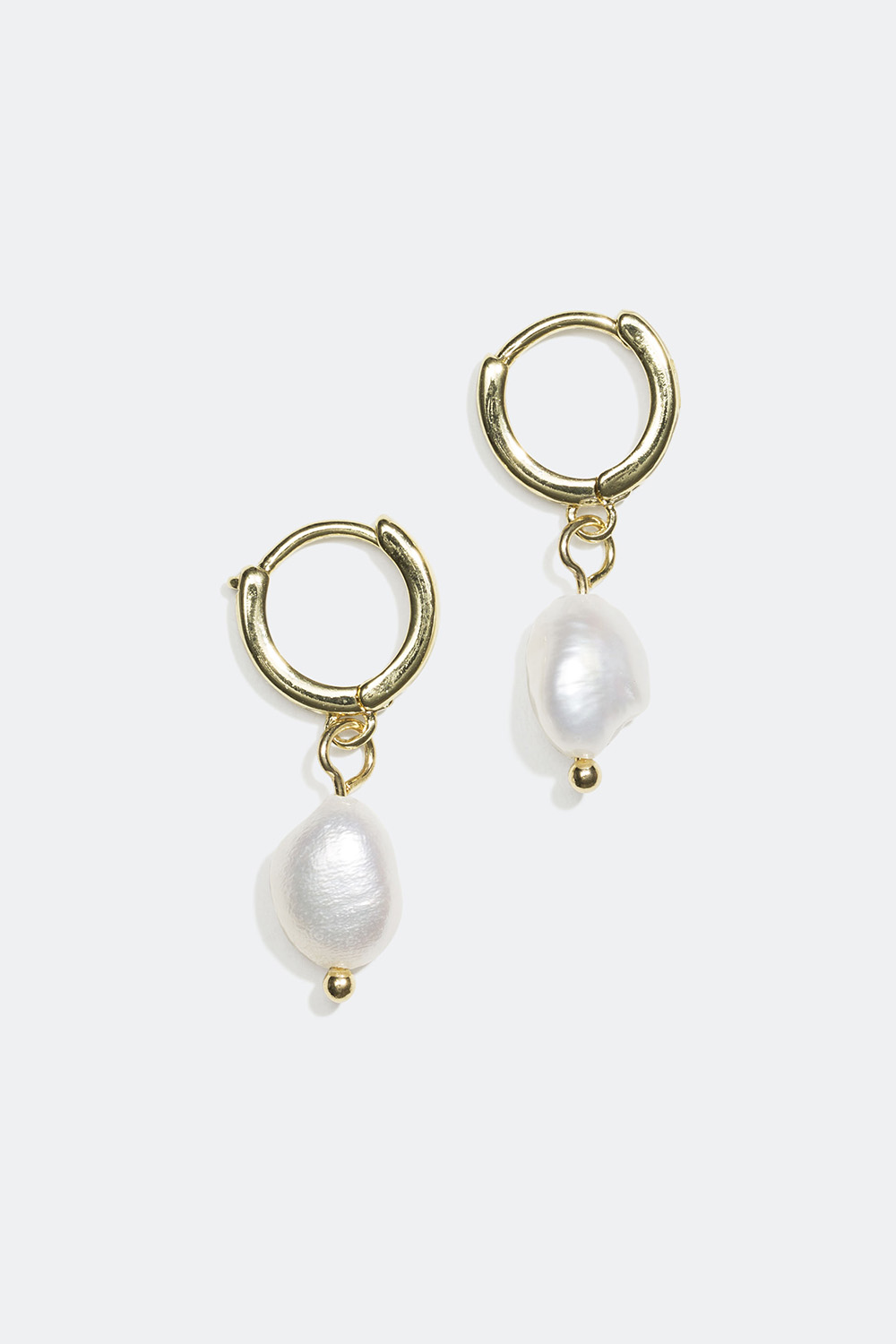 Små creolere i metal, som er dekoreret med skinnende plastperler i asymmetrisk form som vedhæng.