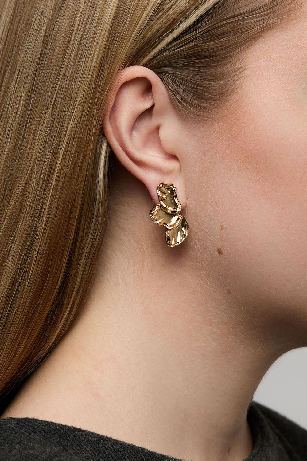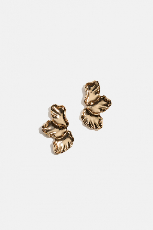 Små kronbladformede øreringe i guldfarvet metal med foldede kanter.