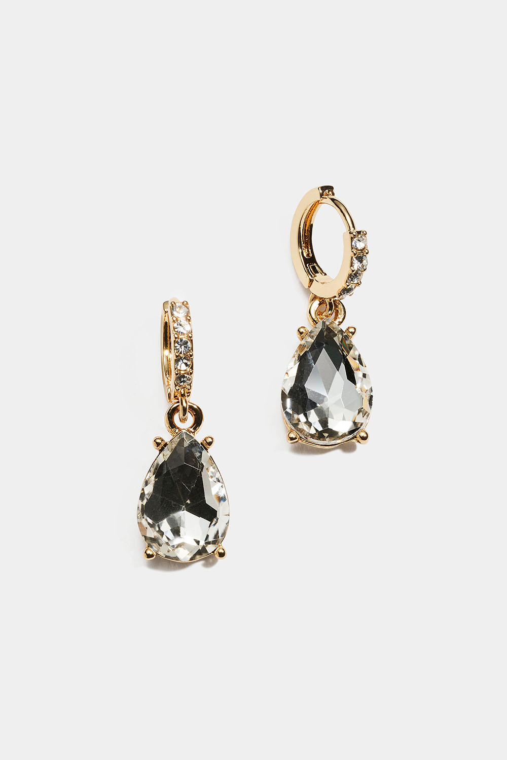 Små hoops i guldfarvet metal dekoreret med små hvide glassten, men en stor hængende glassten i dråbeform.