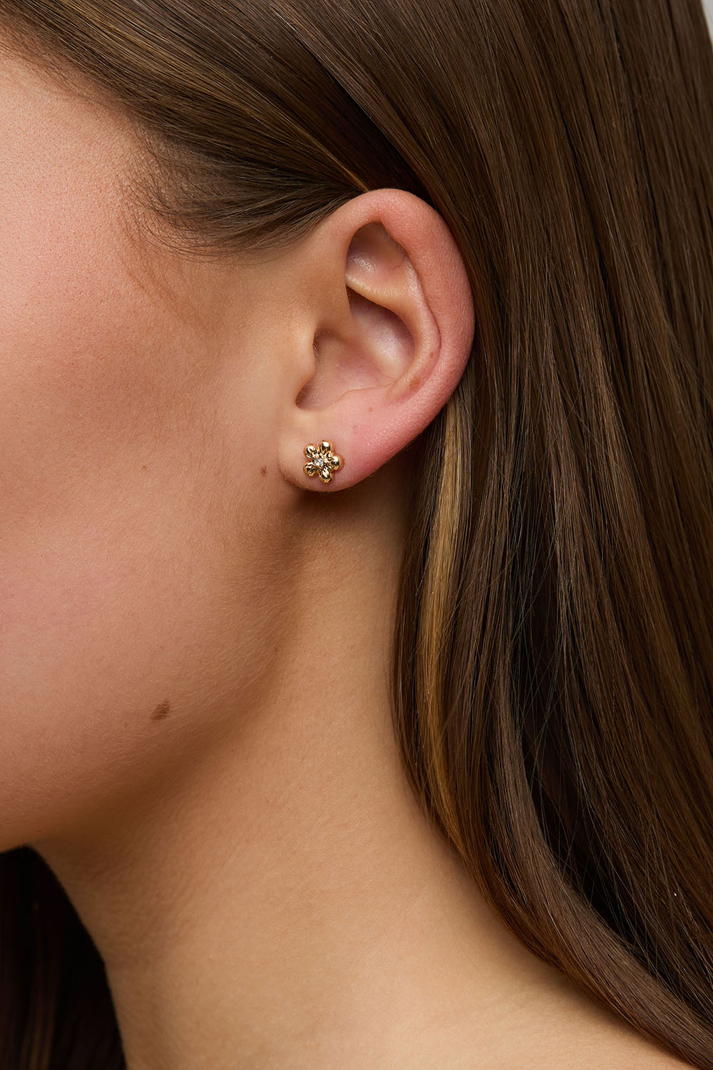 Små ørestikker i guldfarvet metal i form af blomster med en glitrende glassten i midten.