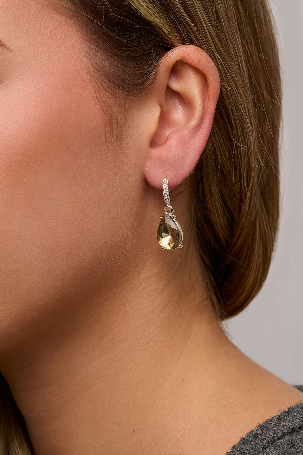 Små hoops i sølvfarvet metal dekoreret med små hvide glassten, men en stor hængende lysebrun glassten i dråbeform.