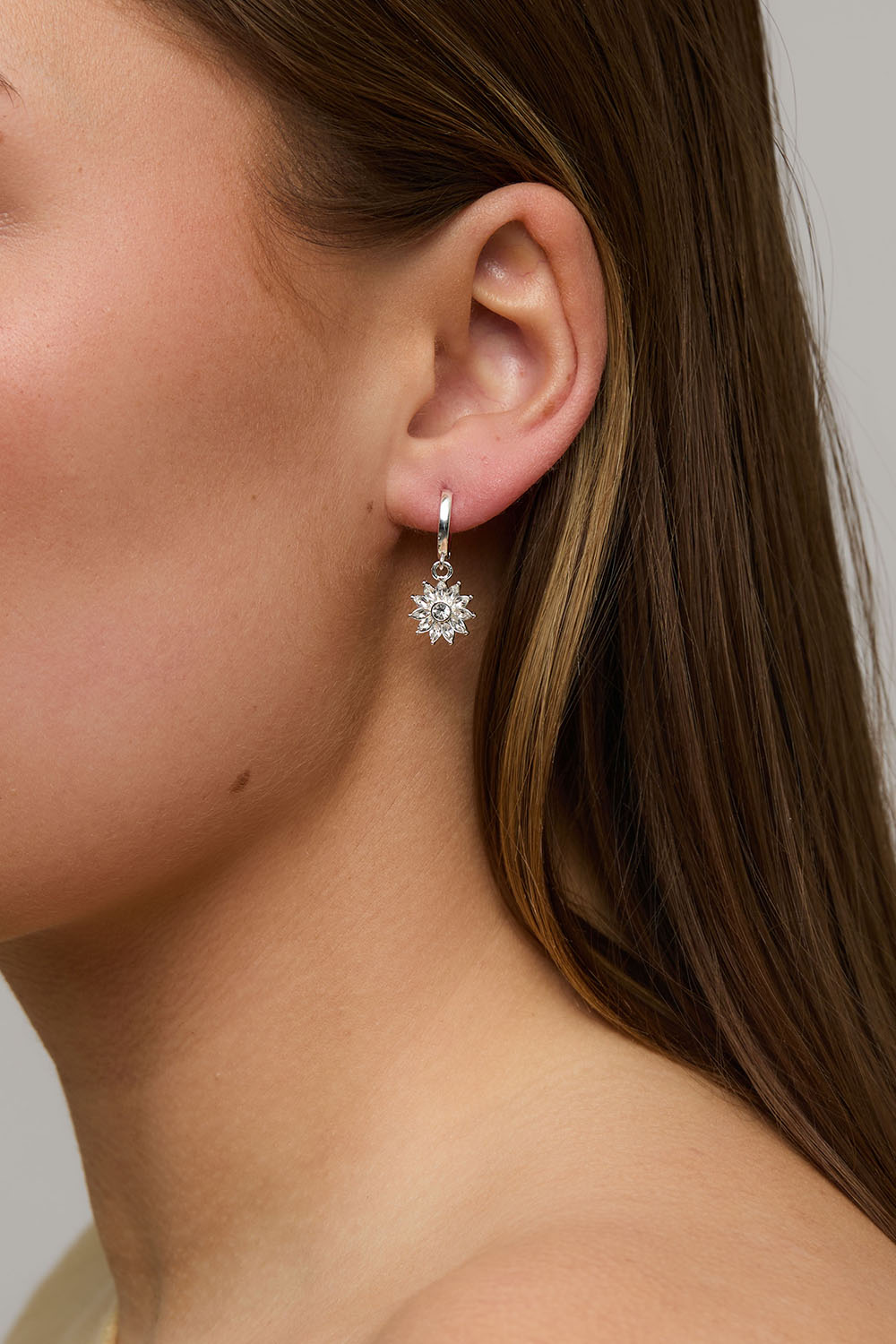 Små hoops i metal med vedhæng af blomster med glitrende glassten.