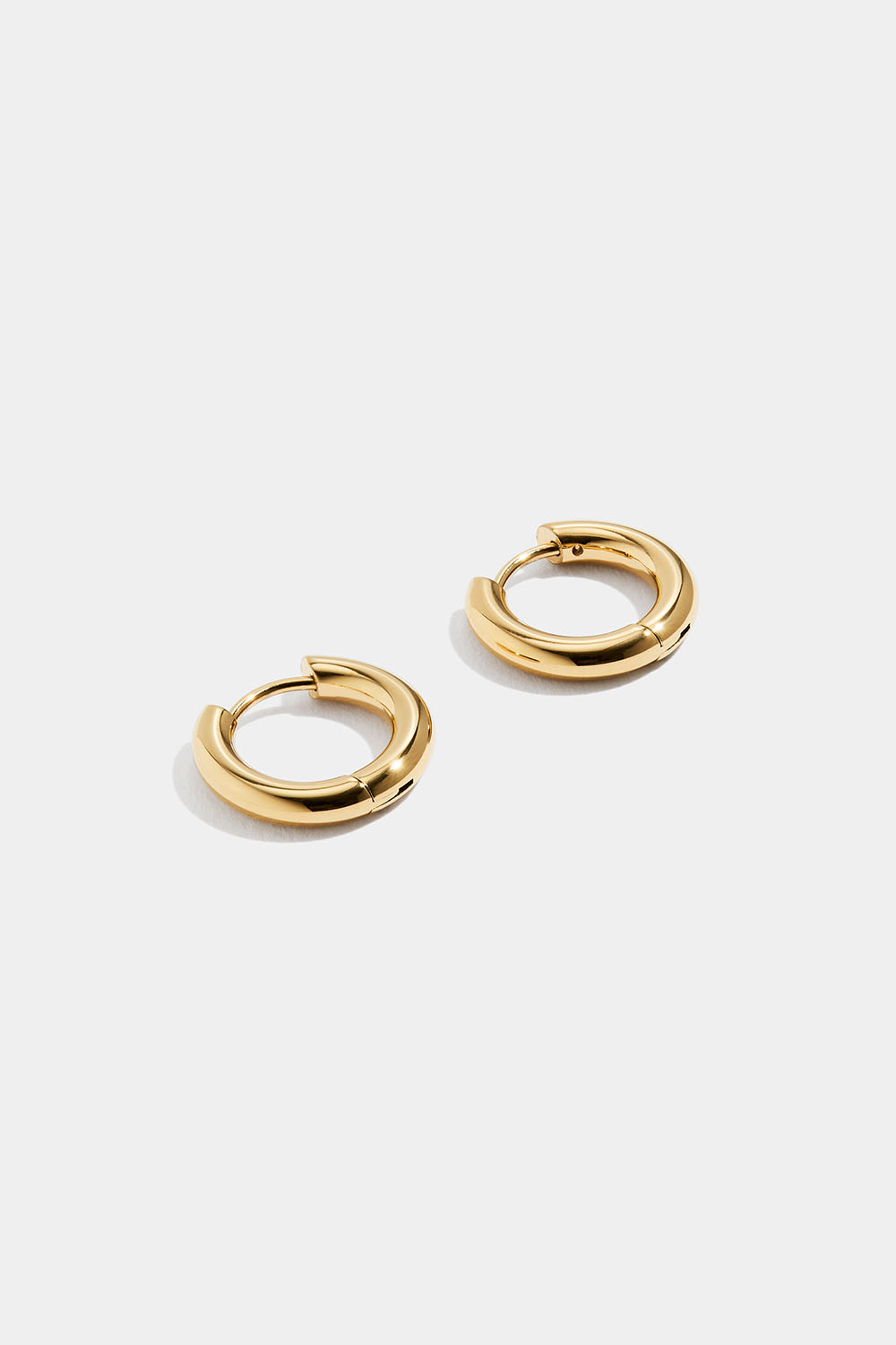 Små, kraftigere hoops i højglanspoleret rustfrit stål, der er PVD-belagt med 18K guld.