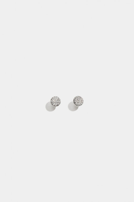 Små flade runde ørestikker i sterlingsølv, dekoreret med klare kubiske zirkonia-sten.