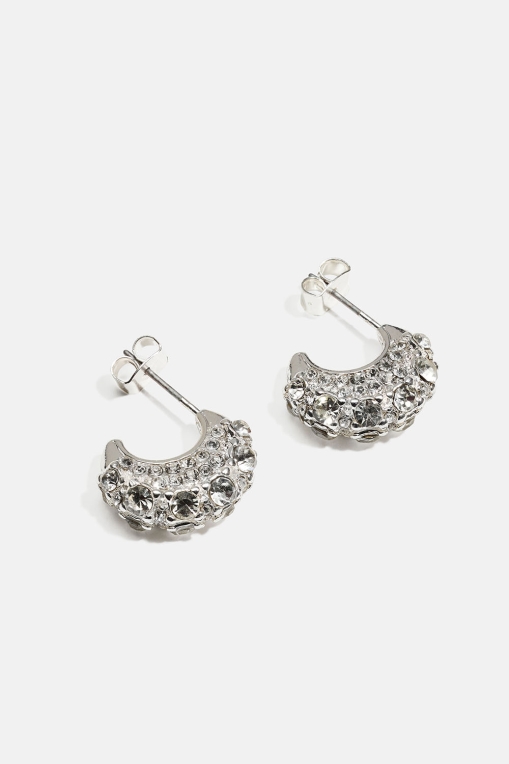 Små hoops i sølvfarvet metal dekoreret med hvide glassten i forskellige størrelser.