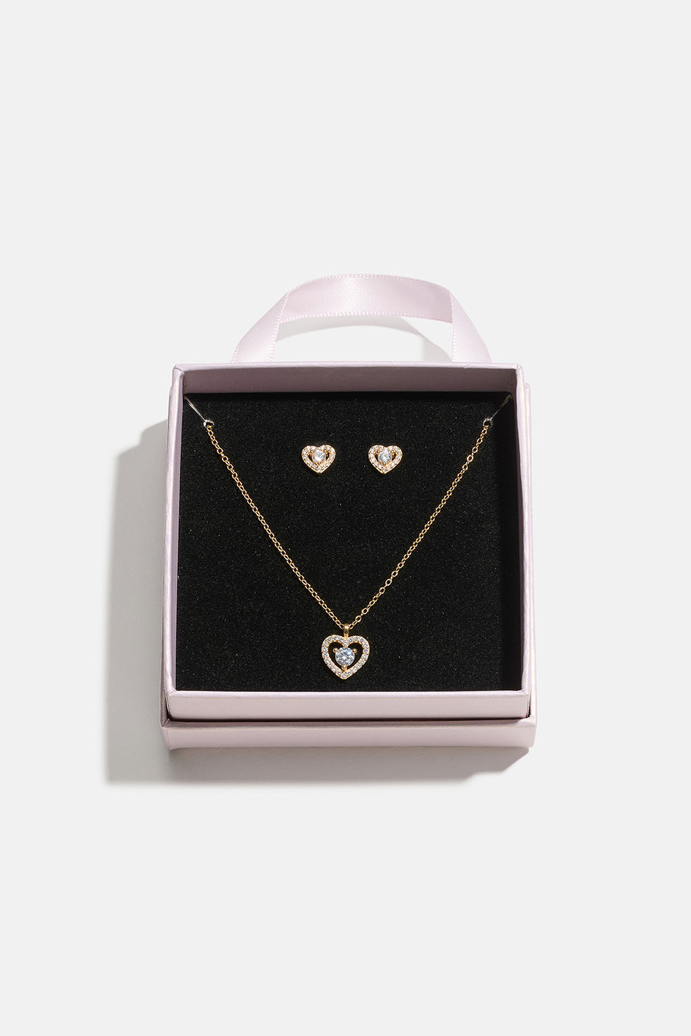 Smykkesættet består af et par ørestikker med hjerter og kubisk zirkonia samt en halskæde med hjertevedhæng og kubisk zirkonia i 18k guldpletteret ægte sølv, smukt indpakket i en lyserød gaveæske med sort velourpude.