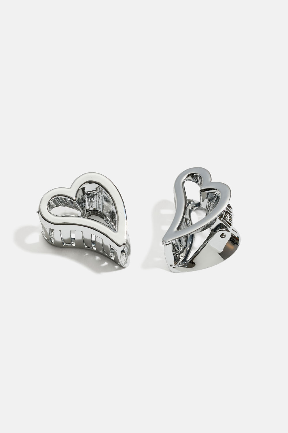 Sølvfarvede hårspænder i hjerteform. Kommer i en to-pak.