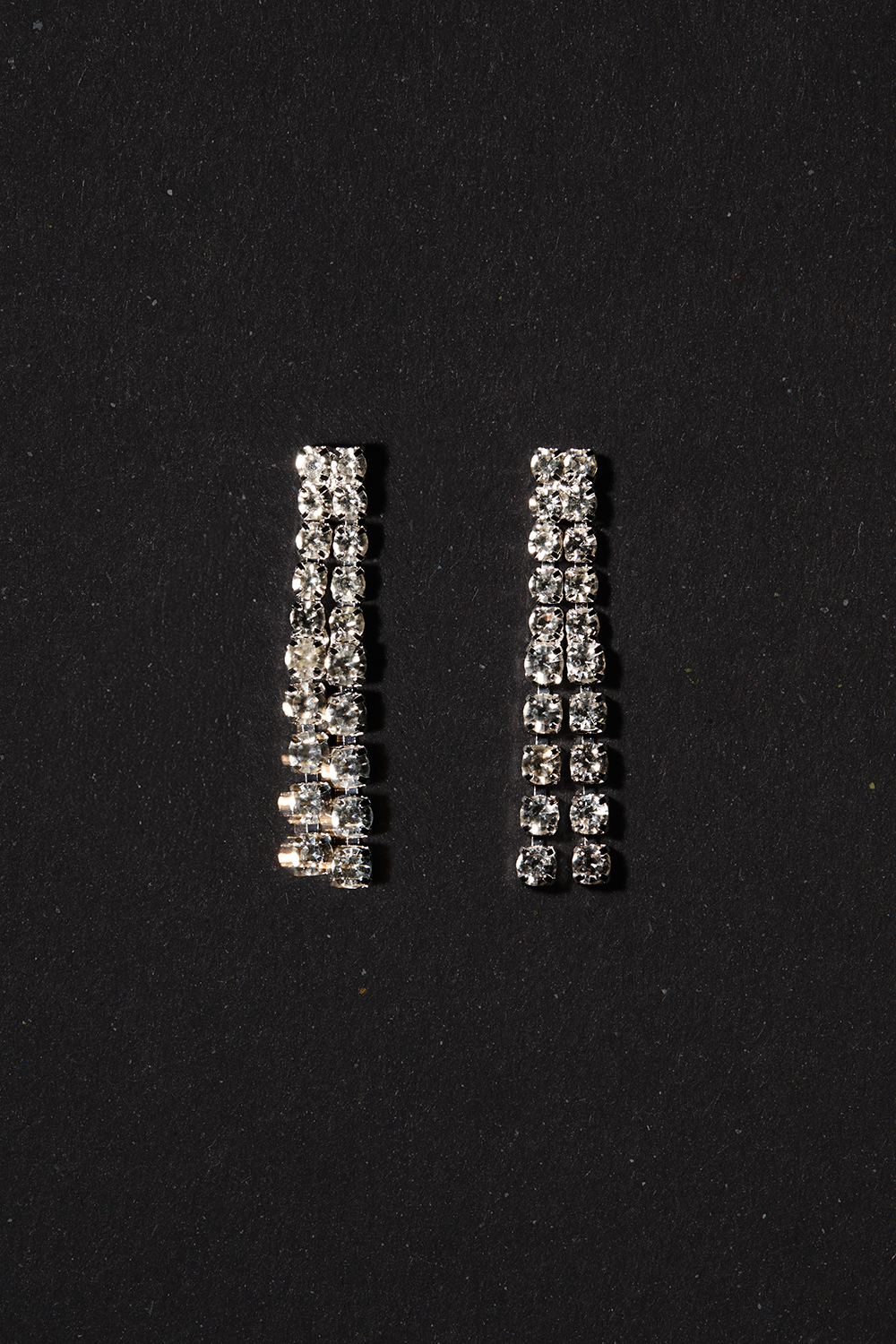 Hængende øreringe i sølvfarvet metal dekoreret med små hvide glassten.