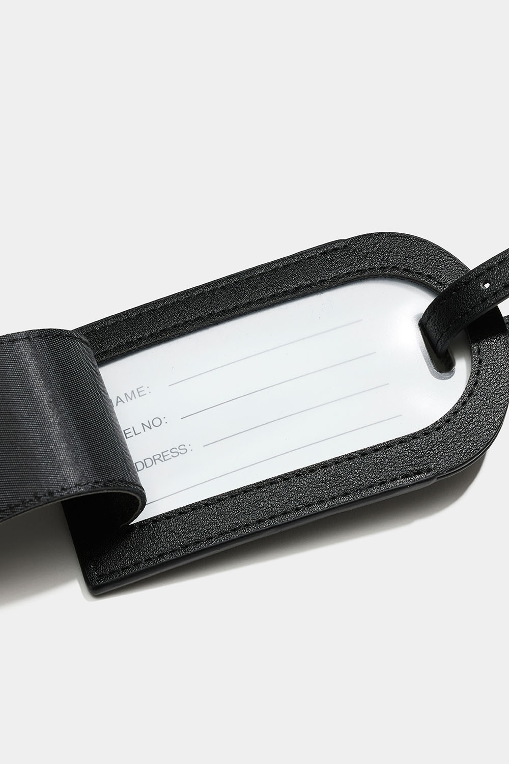 Sort bagagemærke i imiteret læder, som kan sættes på tasken. Indeni kan du skrive dine oplysninger på den medfølgende adresselabel.