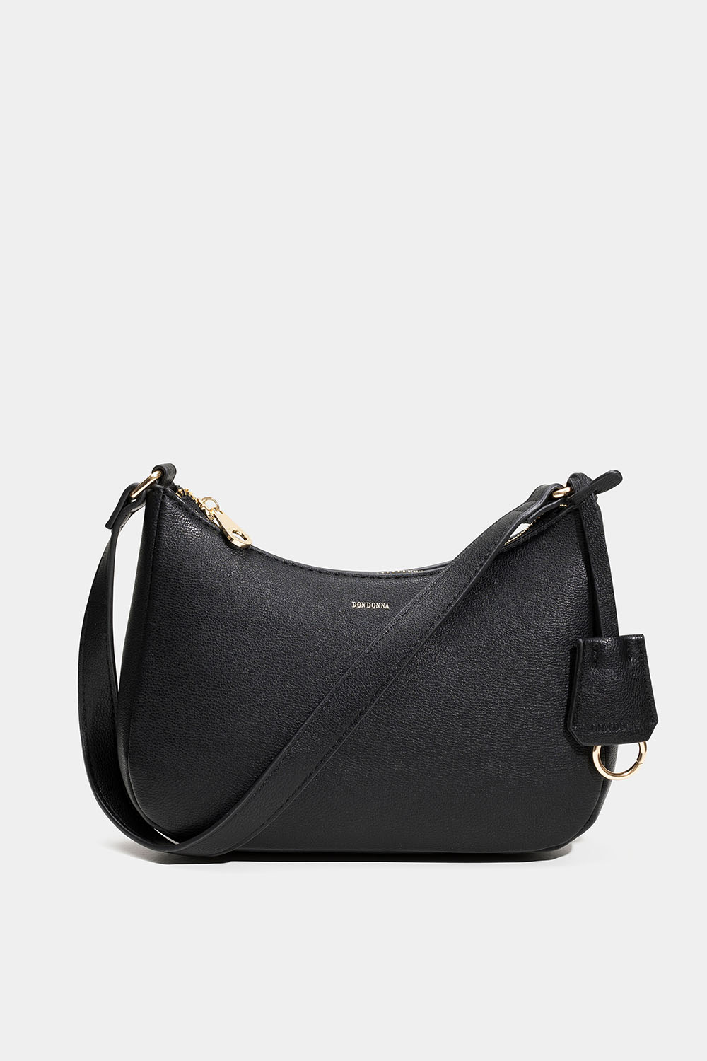 Lille sort baguettetaske fra Don Donna. Tasken har skulderrem og lynlåslukning samt to indvendige rum, det ene med lynlås. Den leveres også med en aftagelig nøglering.
