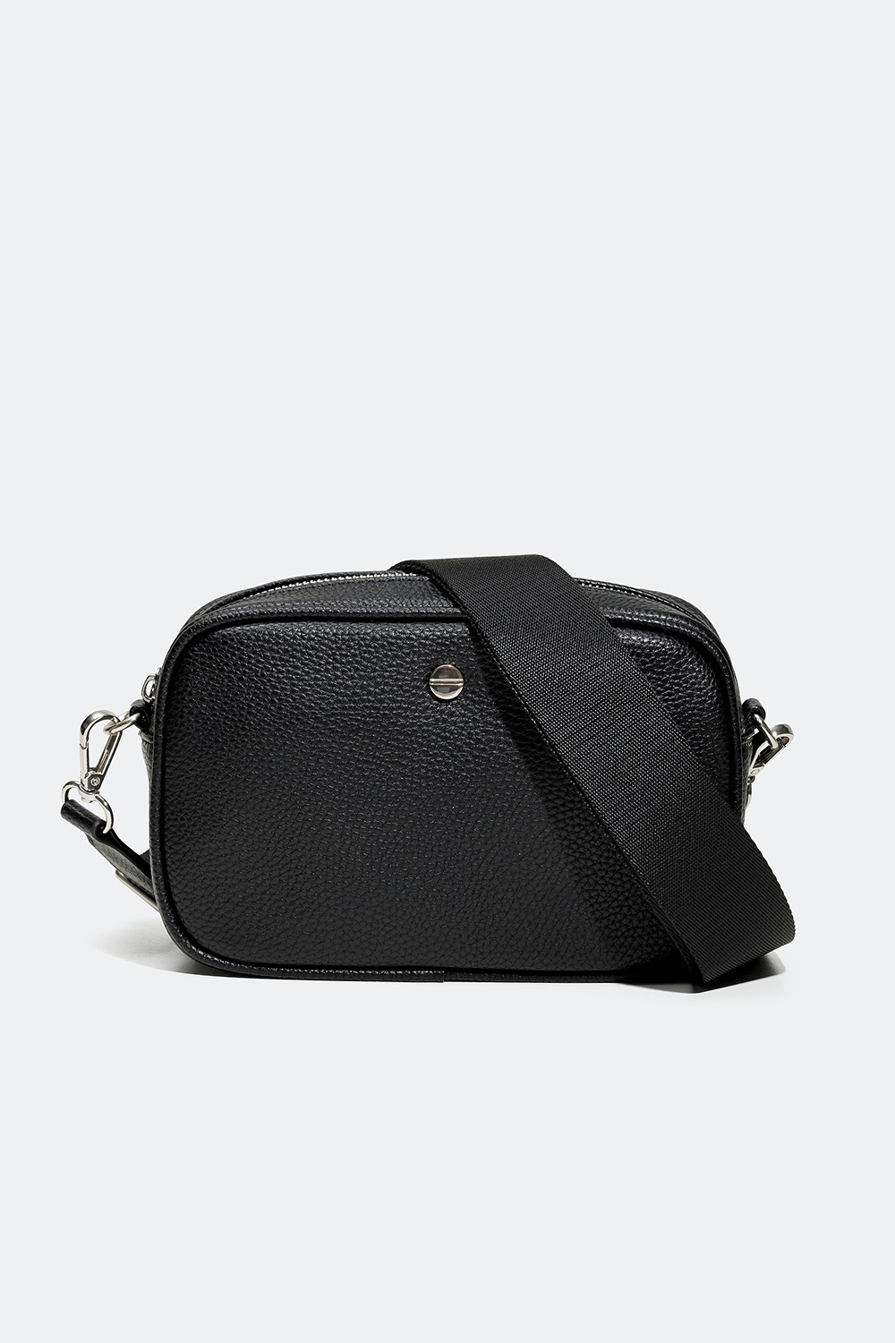 Crossbodytaske i sort lakeret imiteret læder med bred skulderrem. Tasken åbnes og lukkes med en lynlås og har desuden et lille rum med lynlås indvendigt. Skulderremmen er både aftagelig og justerbar, så du kan tilpasse tasken til lejligheden og dit outfit. En minimalistisk taske, der passer både som hverdagstaske og taske til fest. Perfekt størrelse til dine vigtigste nødvendigheder.