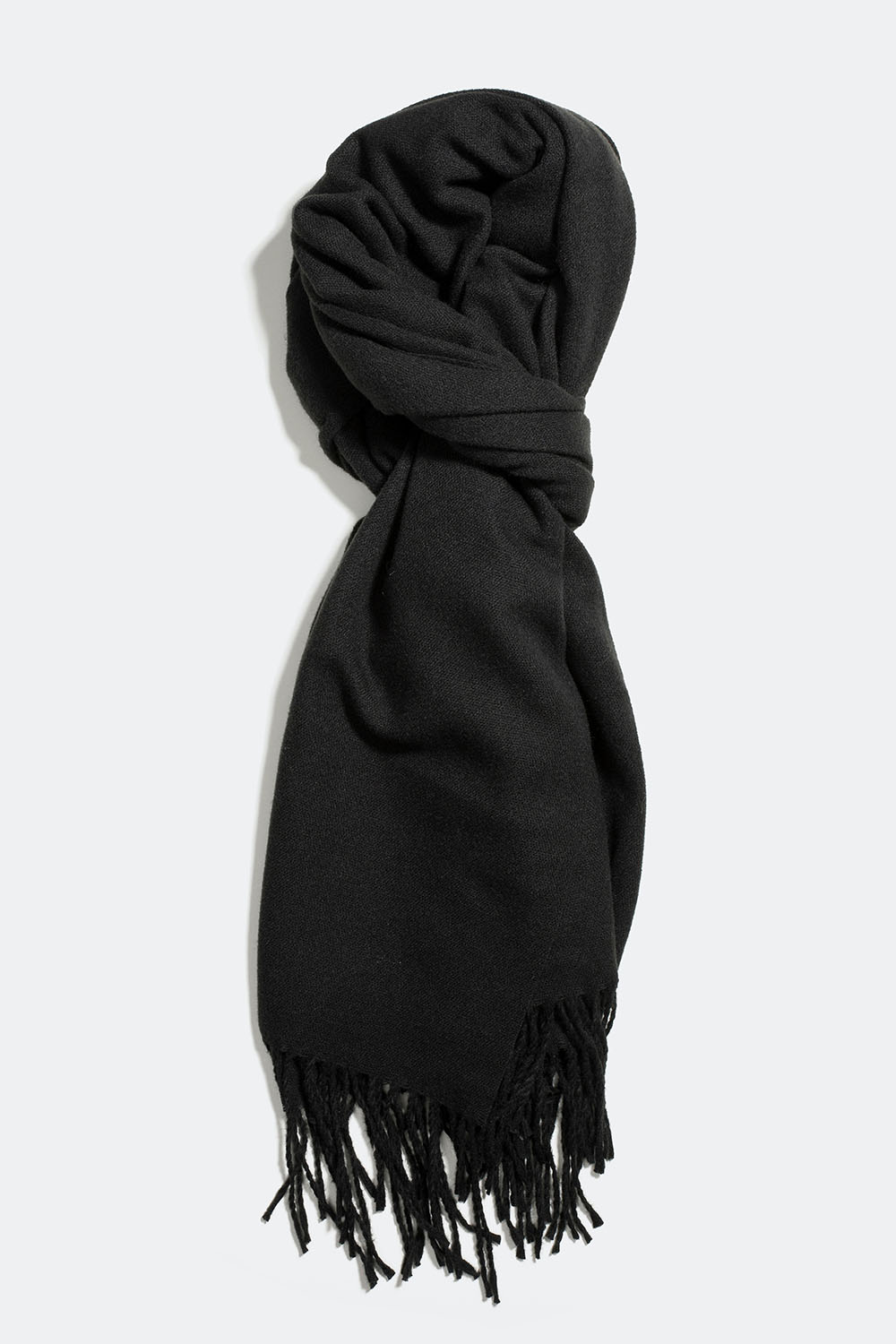 Sort tørklæde med frynser i et tyndt, blødt materiale. Perfekt tilbehør til koldere dage.