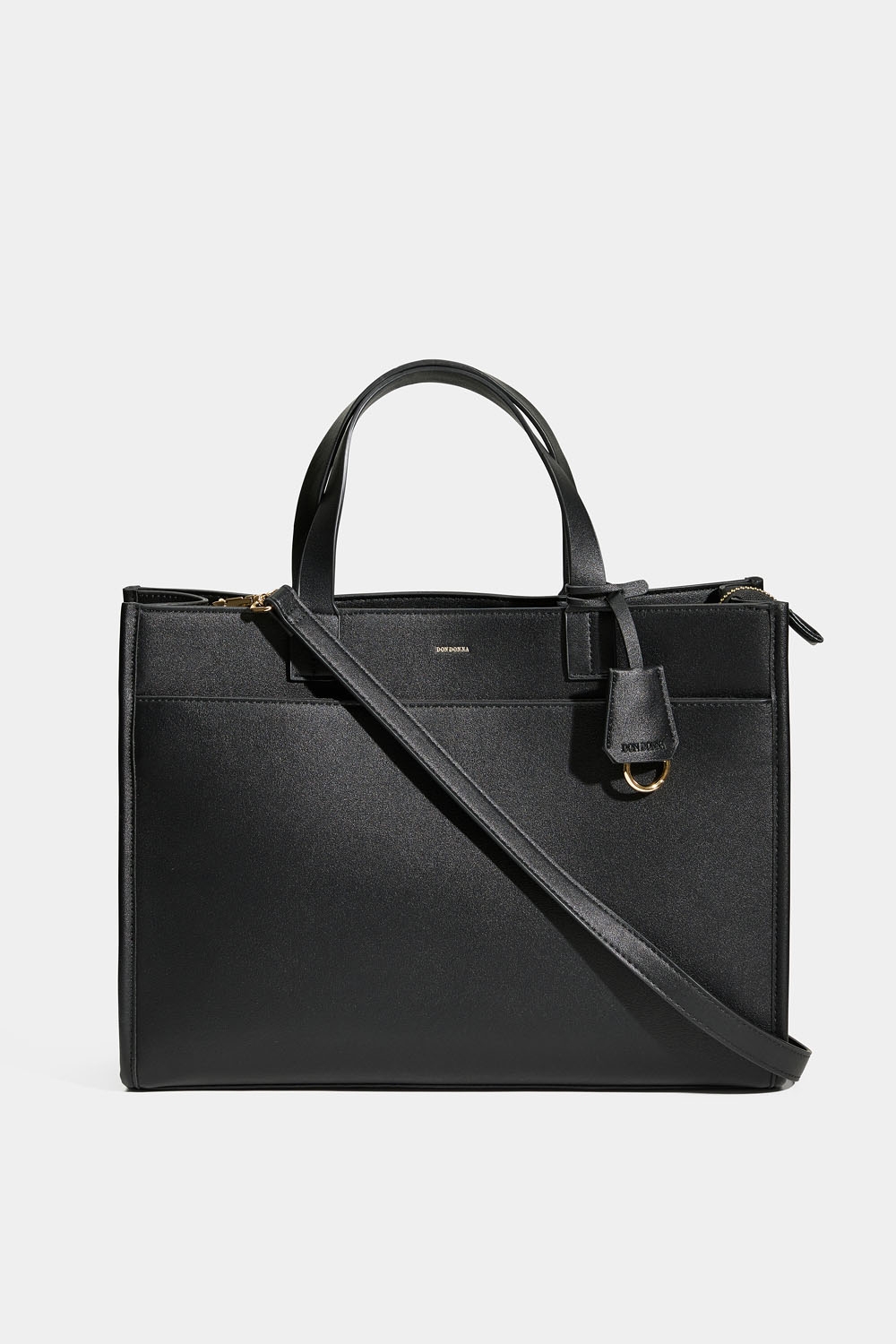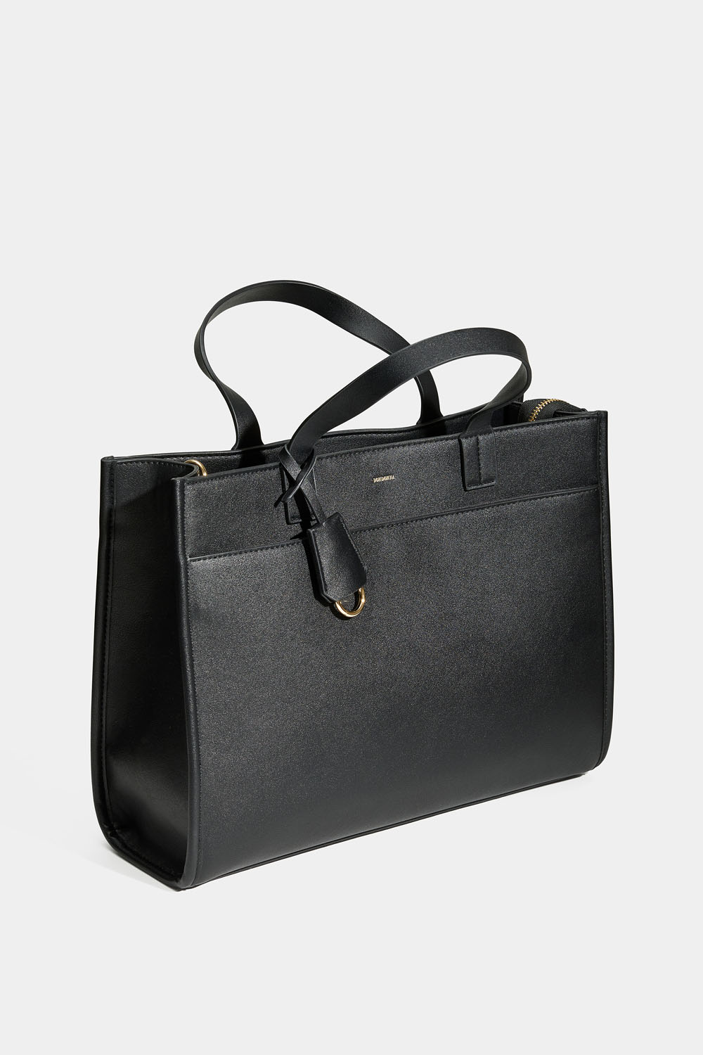 Sort rektangulær håndtaske i imiteret læder. Den har lynlåslukning, dobbelte håndtag og skulderrem samt en nøglering, et lille rum med lynlås, et rum på ydersiden og et indvendigt rum med plads til en bærbar computer. Computerrummet har plads til en 14" computer, svarende til 33 x 23 cm.