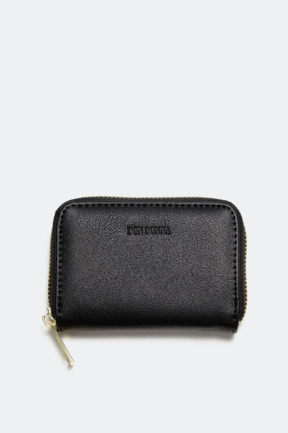 Pung i sort imiteret læder til kort og sedler med Don Donna-logoet præget foran. Praktisk lille pung med små rum til kort. Pungen lukkes med en lynlås, som holder indholdet sikkert på plads. stilren pung, der passer perfekt til vores Don Donna tasker.