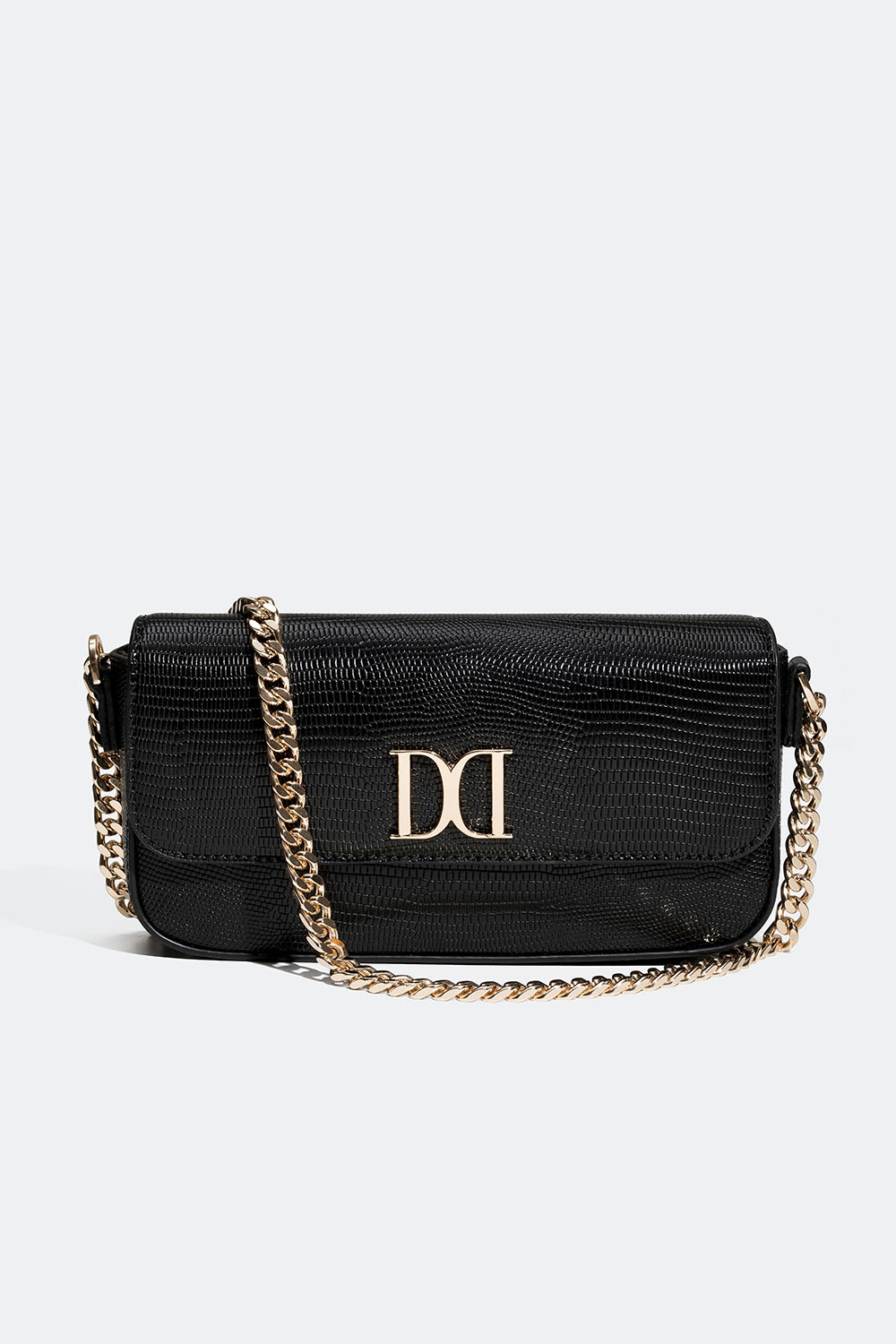 Sort skuldertaske i imiteret slangeskind med guldfarvet Don Donna-logo på forsiden. En stilfuld taske med en guldfarvet kæderem. Tasken har et større rum, som lukkes med to magnetiske knapper.