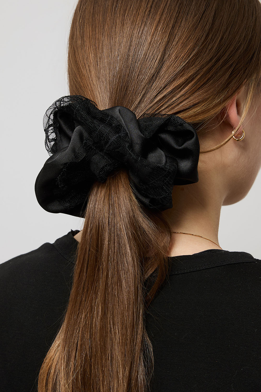 Sort scrunchie i imiteret silke og blondedetalje i gruppen Håraccessories / Scrunchies hos Glitter (332002029000)