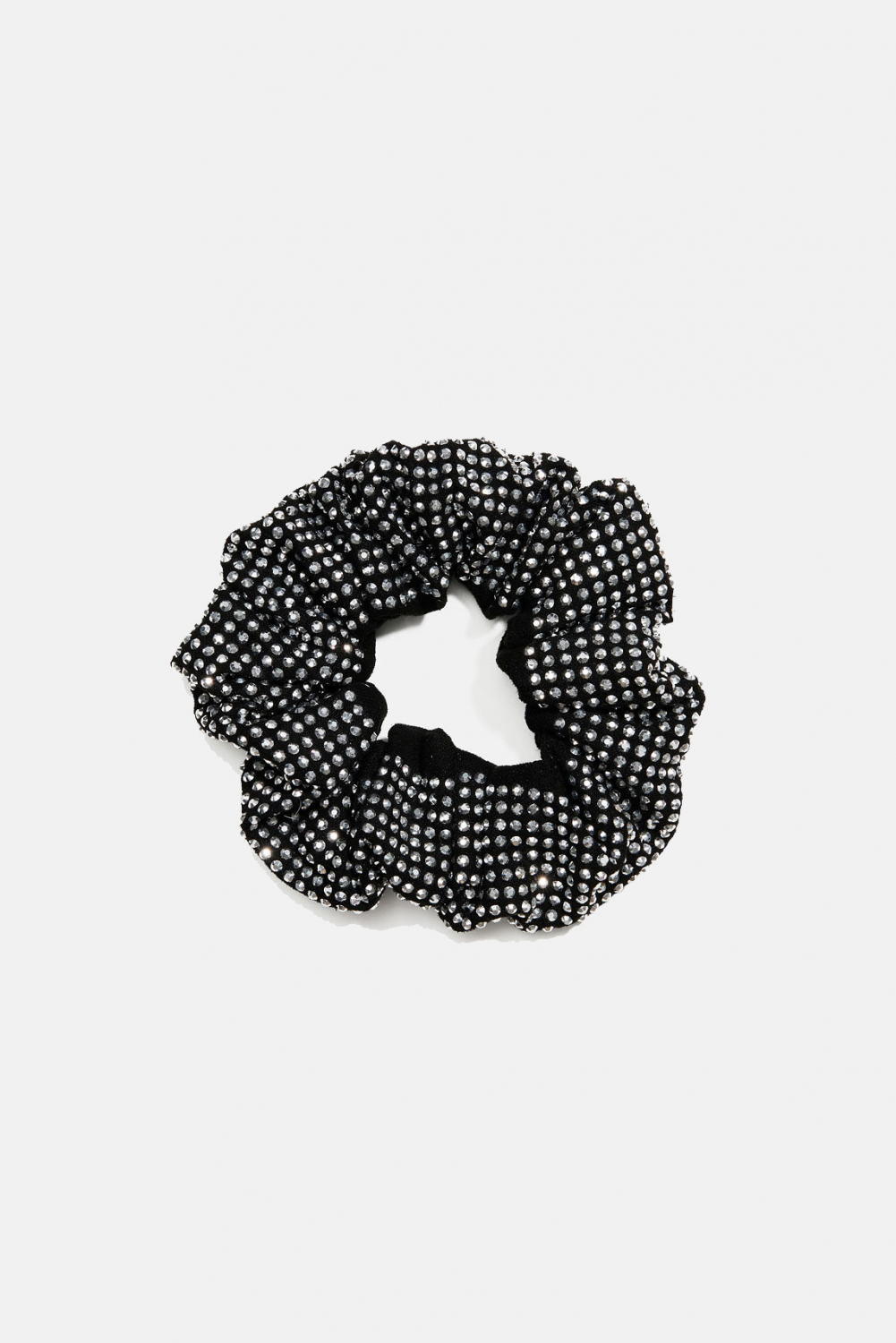 Lille scrunchie i sort stof dekoreret med små sølvpailletter.