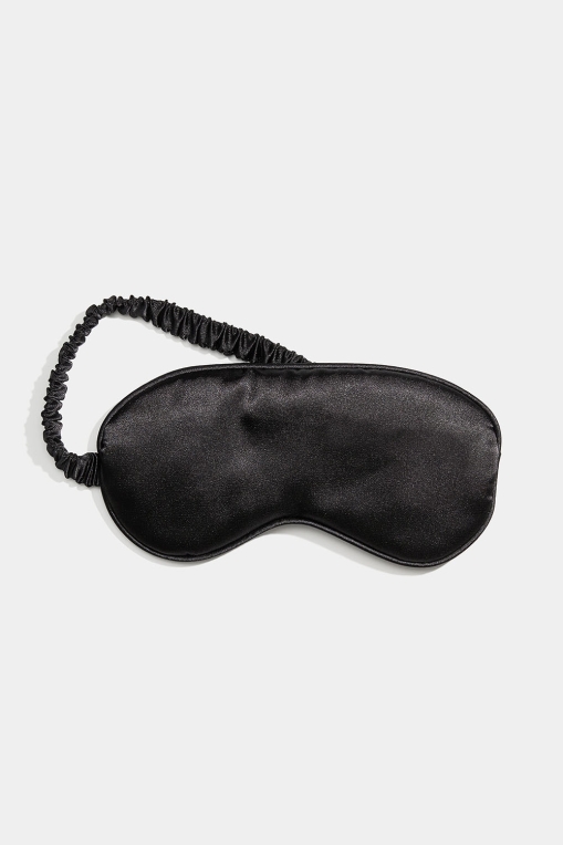 Let polstret sovemaske i sort satin med elastisk bånd, der fastgøres omkring hovedet.