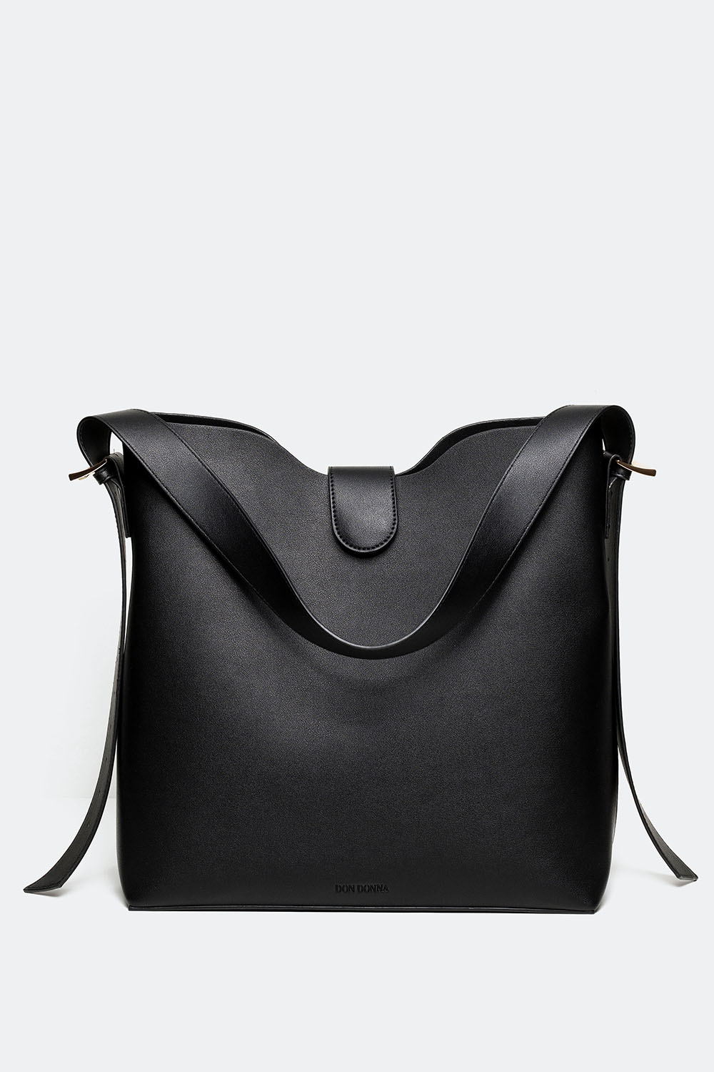 Stor, sort taske med Don Donna-logoet præget foran. Tasken har en justerbar skulderrem, så du også kan bære den som crossbody. Der følger også en mindre indsyet indertaske med, som kan lukkes med en lynlås. Et perfekt, rummeligt tilbehør til f.eks. arbejdet.