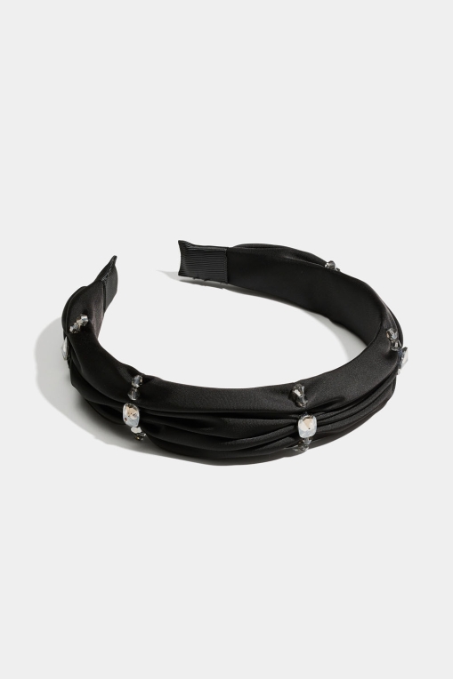 Tiara i sort, rynket stof dekoreret med gennemsigtige perler.