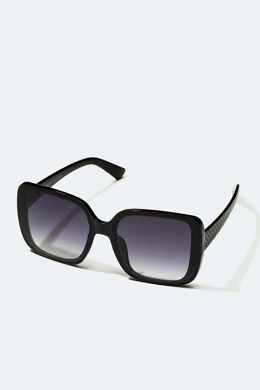 Sorte oversize solbriller med firkantet design. Solbrillerne har tonede glas i en mørk tone og bredt stel i sort farve med mønstrede stænger.