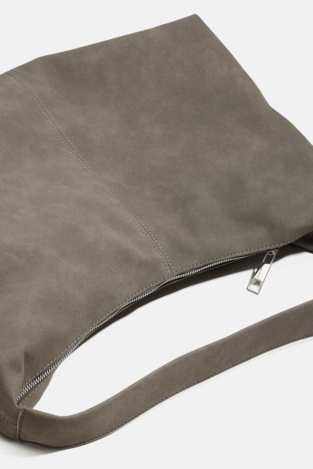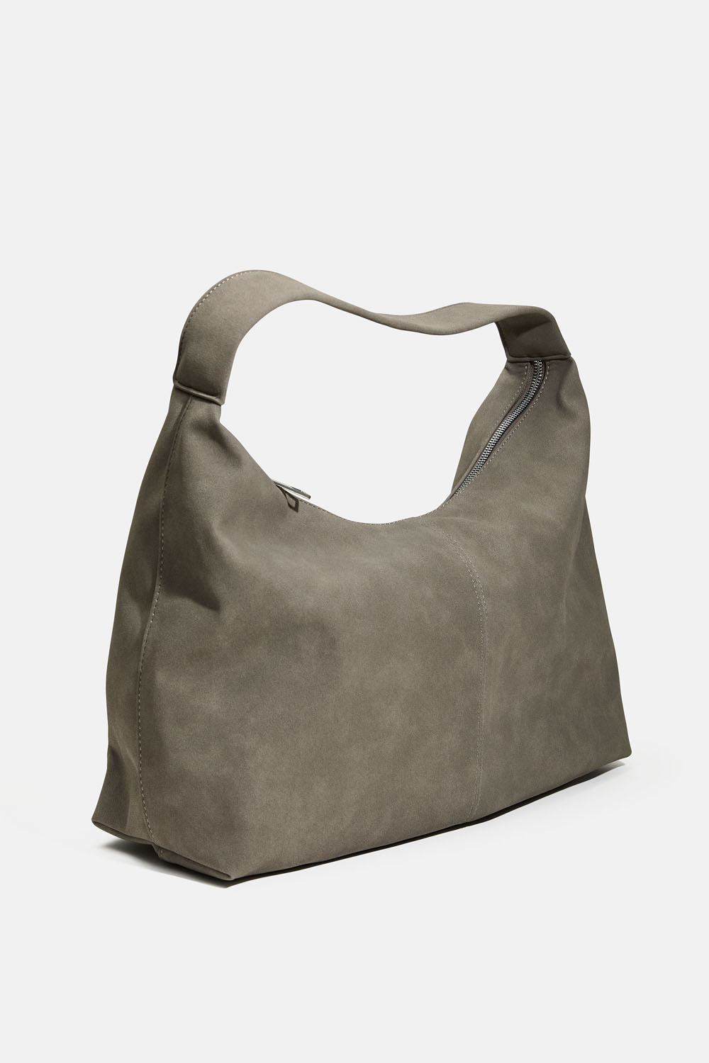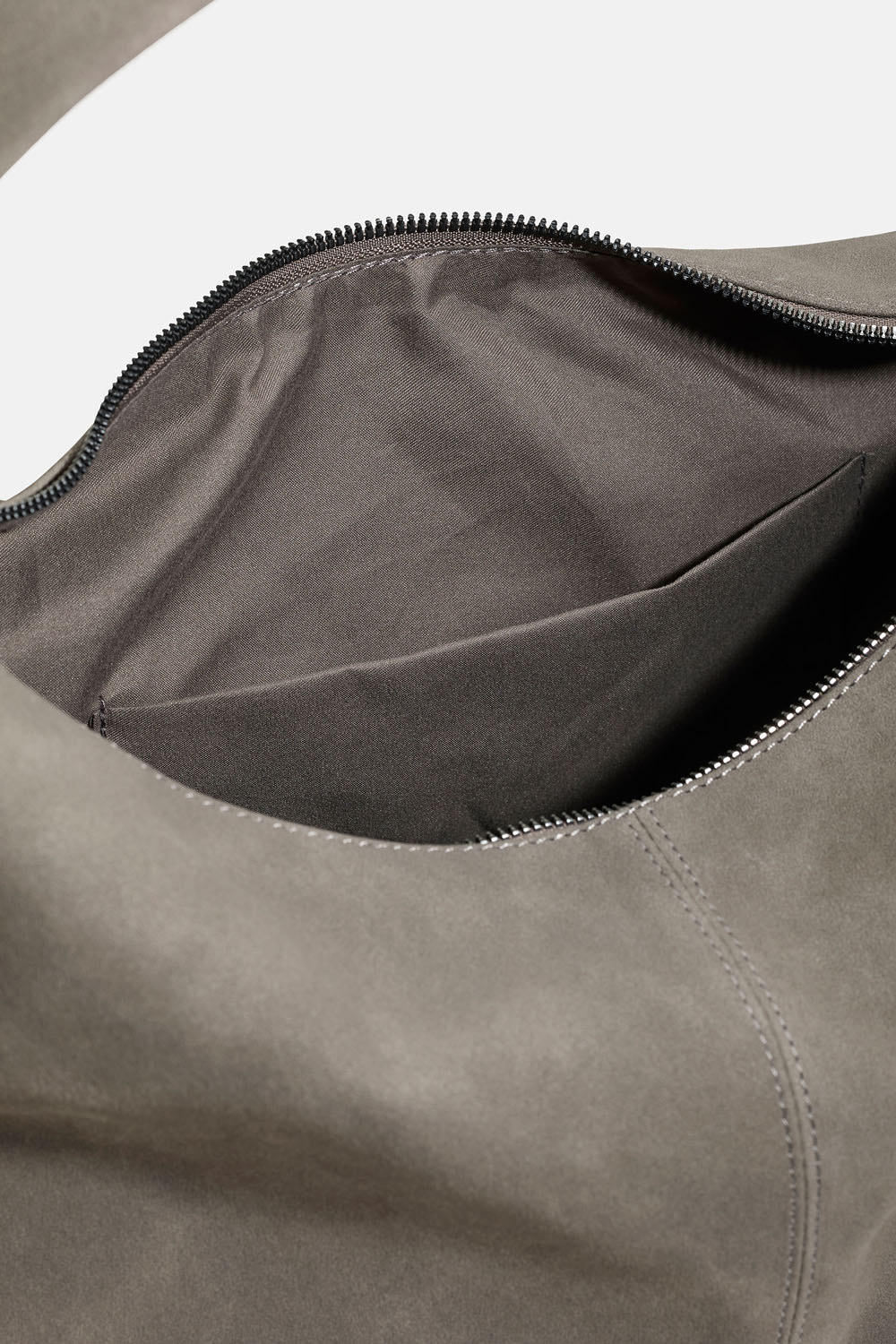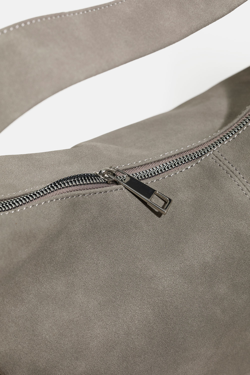 Taske i grå ruskindsimitation med hobo-stil. Tasken lukkes med en lynlås og har desuden et lille rum med lynlås indvendigt.