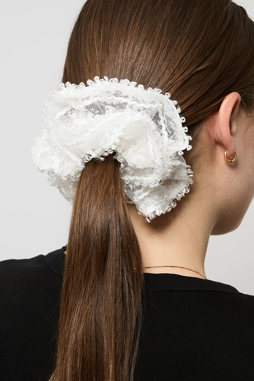 Stor scrunchie med hvidt dekorativt blondestof.