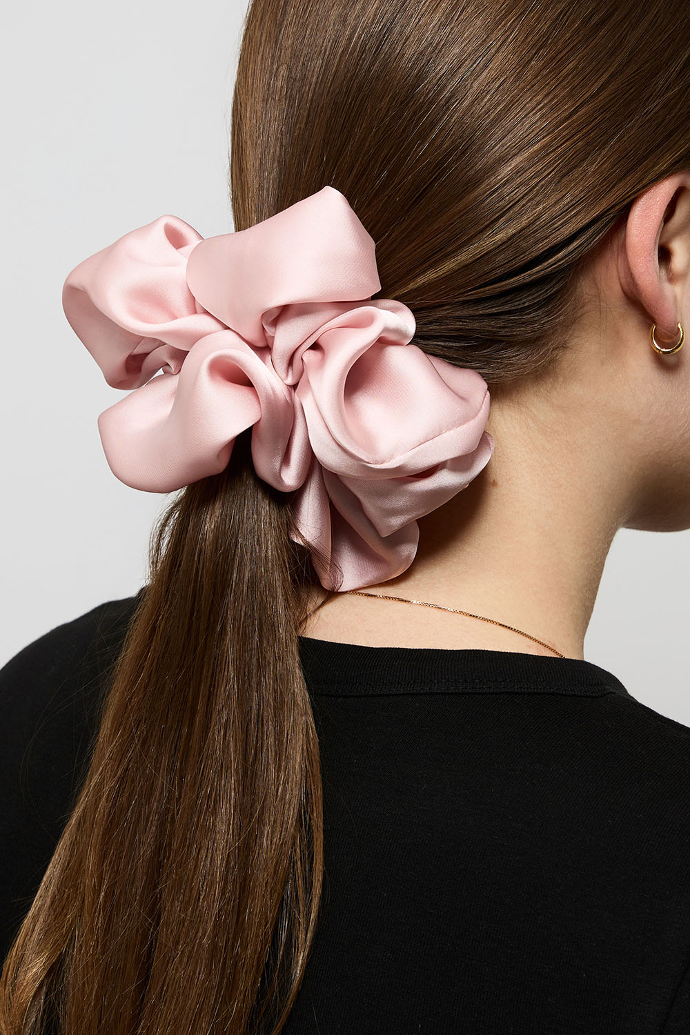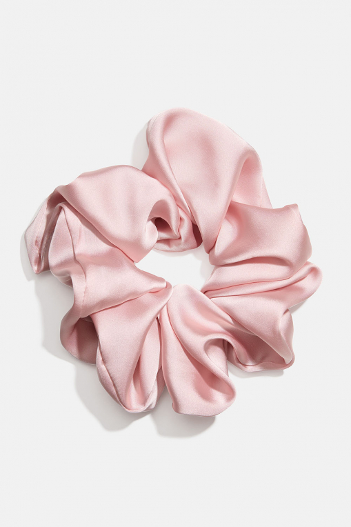 Stor lyserød scrunchie i skinnende imiteret silke. Et flot hårtilbehør med masser af volumen, der passer perfekt til f.eks. en lang hestehale eller en knold.