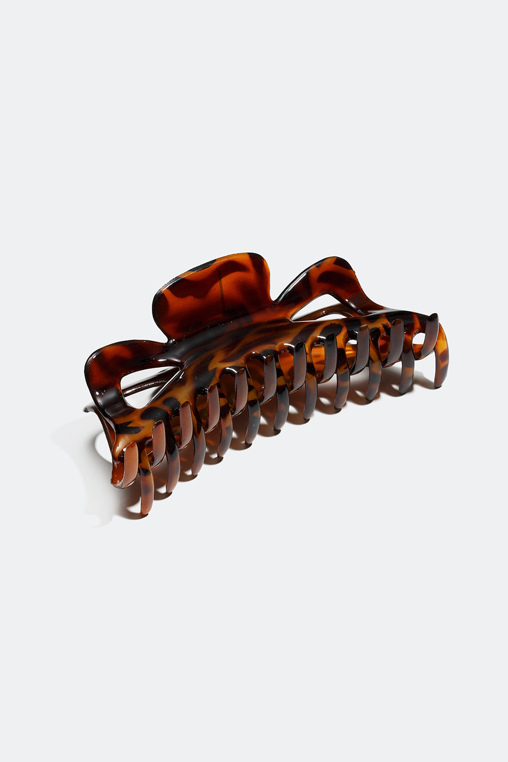 Hårklemme med klassisk design i en stor model, der egner sig til opsætning af langt og fyldigt hår. Den har en brun farve med et meleret mønster og passer perfekt til dig, der har tykt eller krøllet hår.