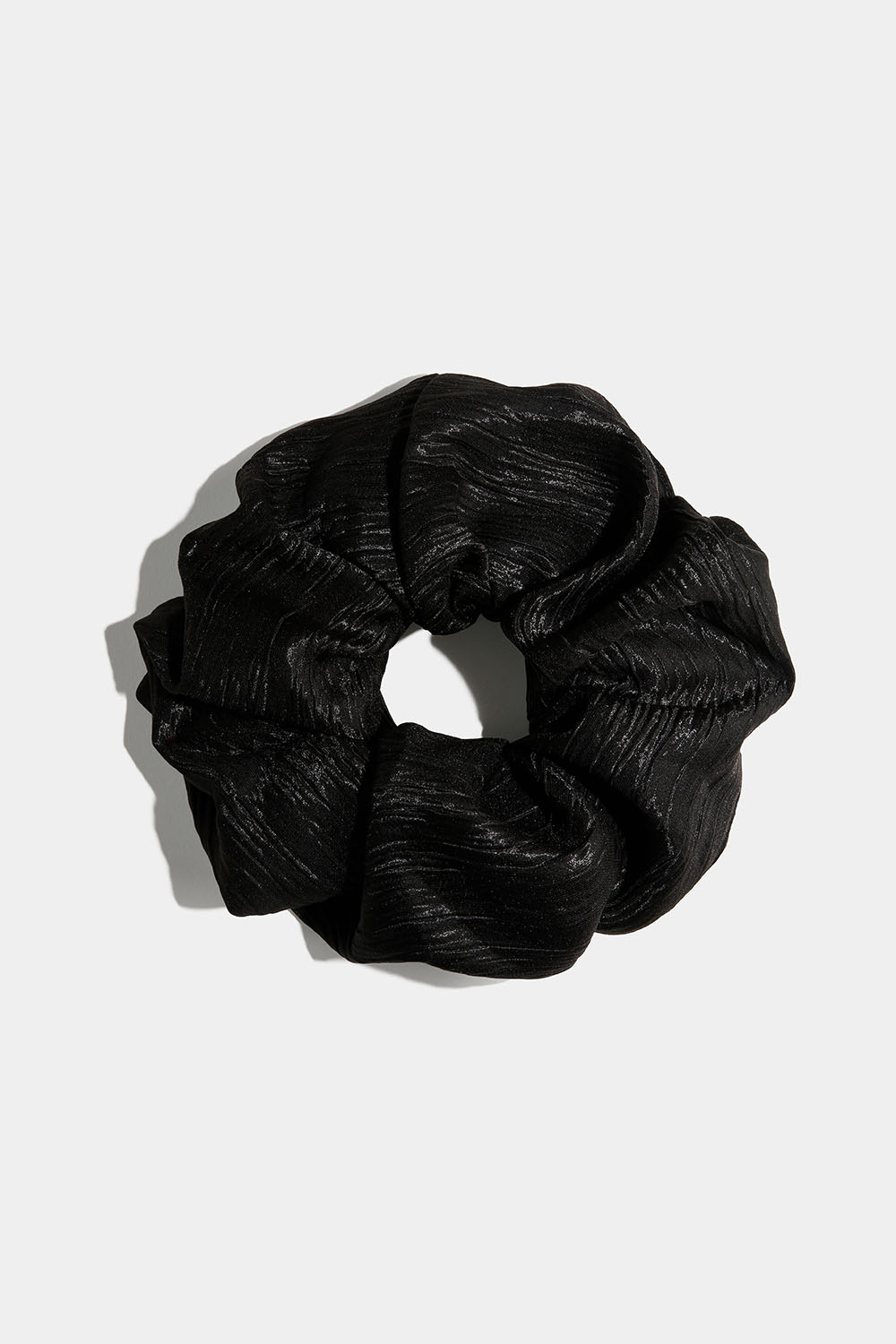 Stor scrunchie i sort, glansfuldt, plisseret stof.