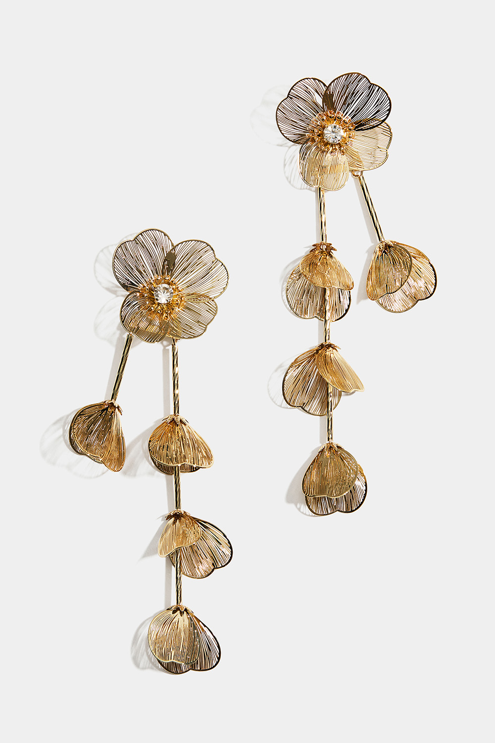 Store guldfarvede øreringe med blomster og hængende blomsterblad