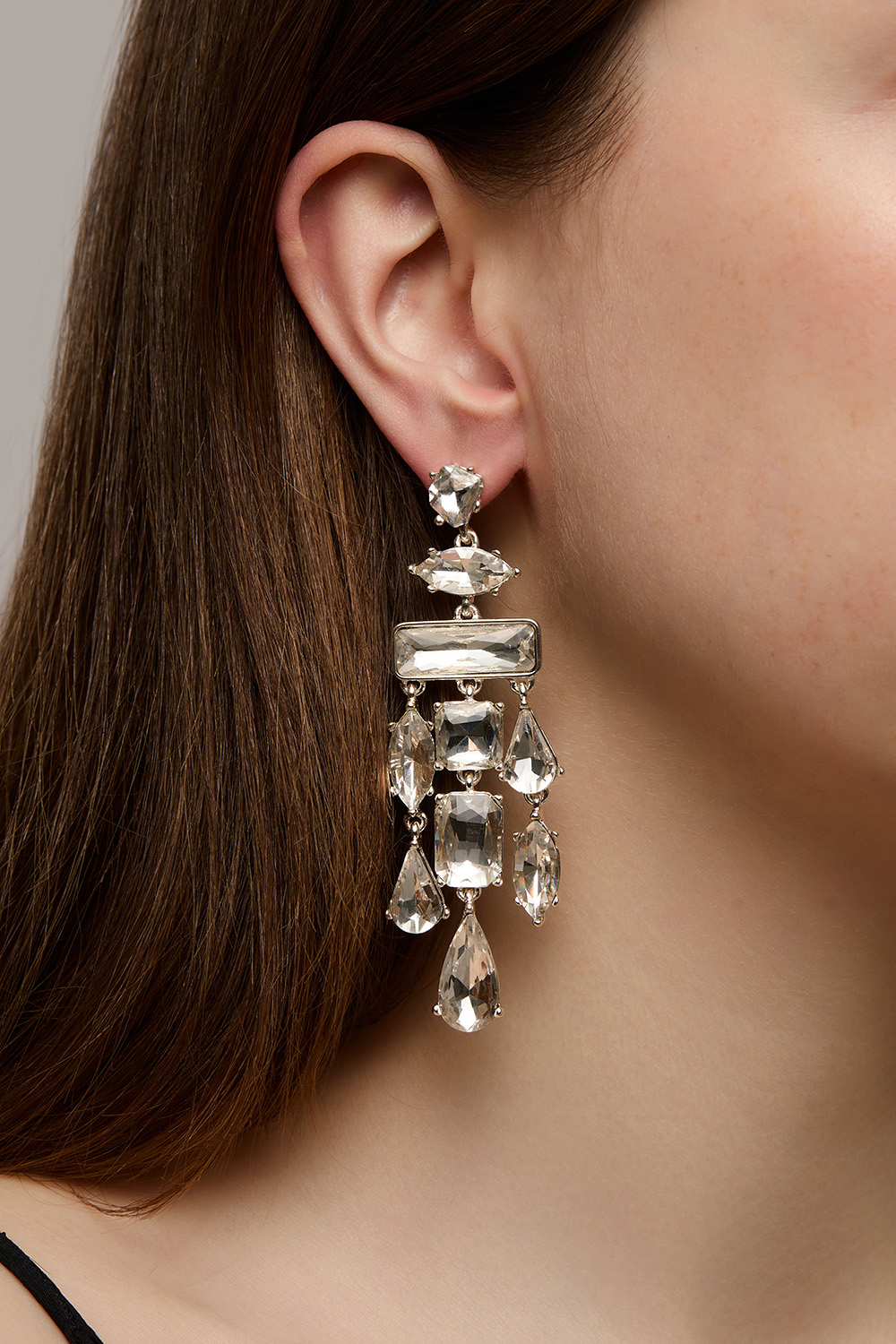 Øreringe i sølvfarvet metal med hvide hængende glassten i forskellige former og størrelser.