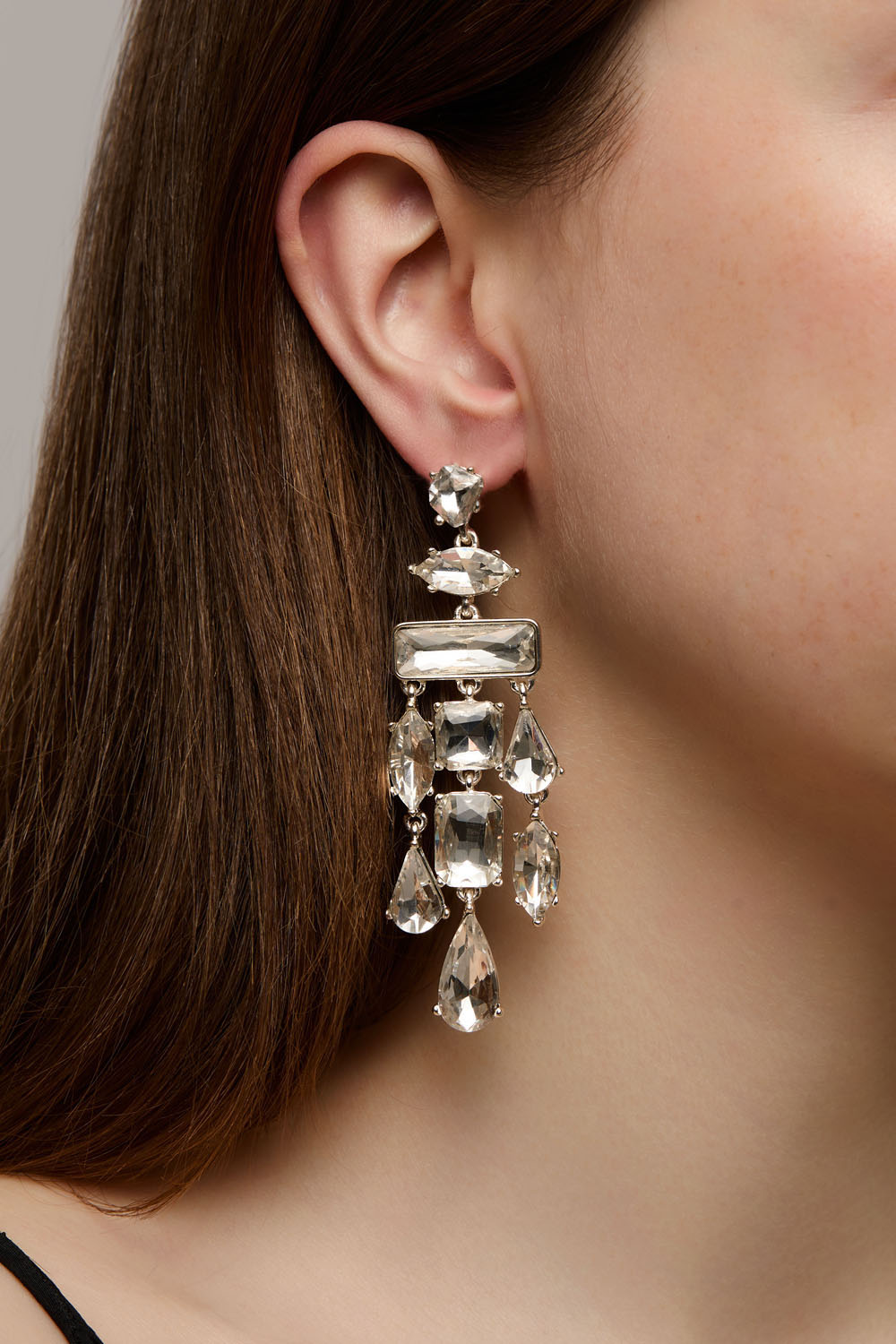 Øreringe i guldfarvet metal med rosa, beige og brune hængende glassten i forskellige former og størrelser.