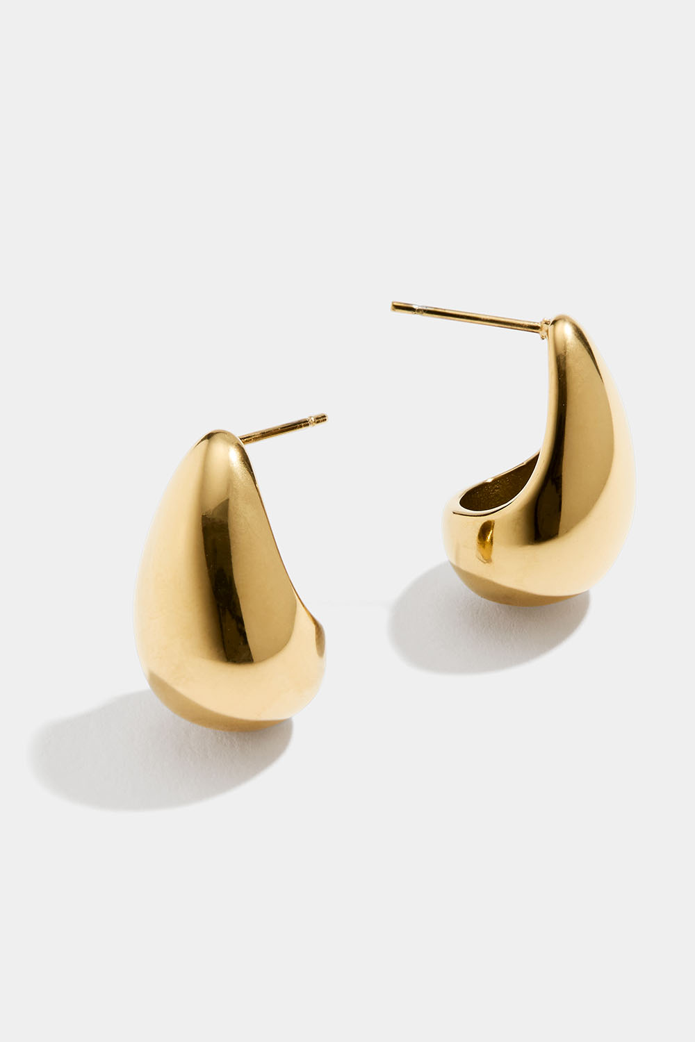Større dråbeformede øreringe i højglanspoleret rustfrit stål, der er PVD-belagt.