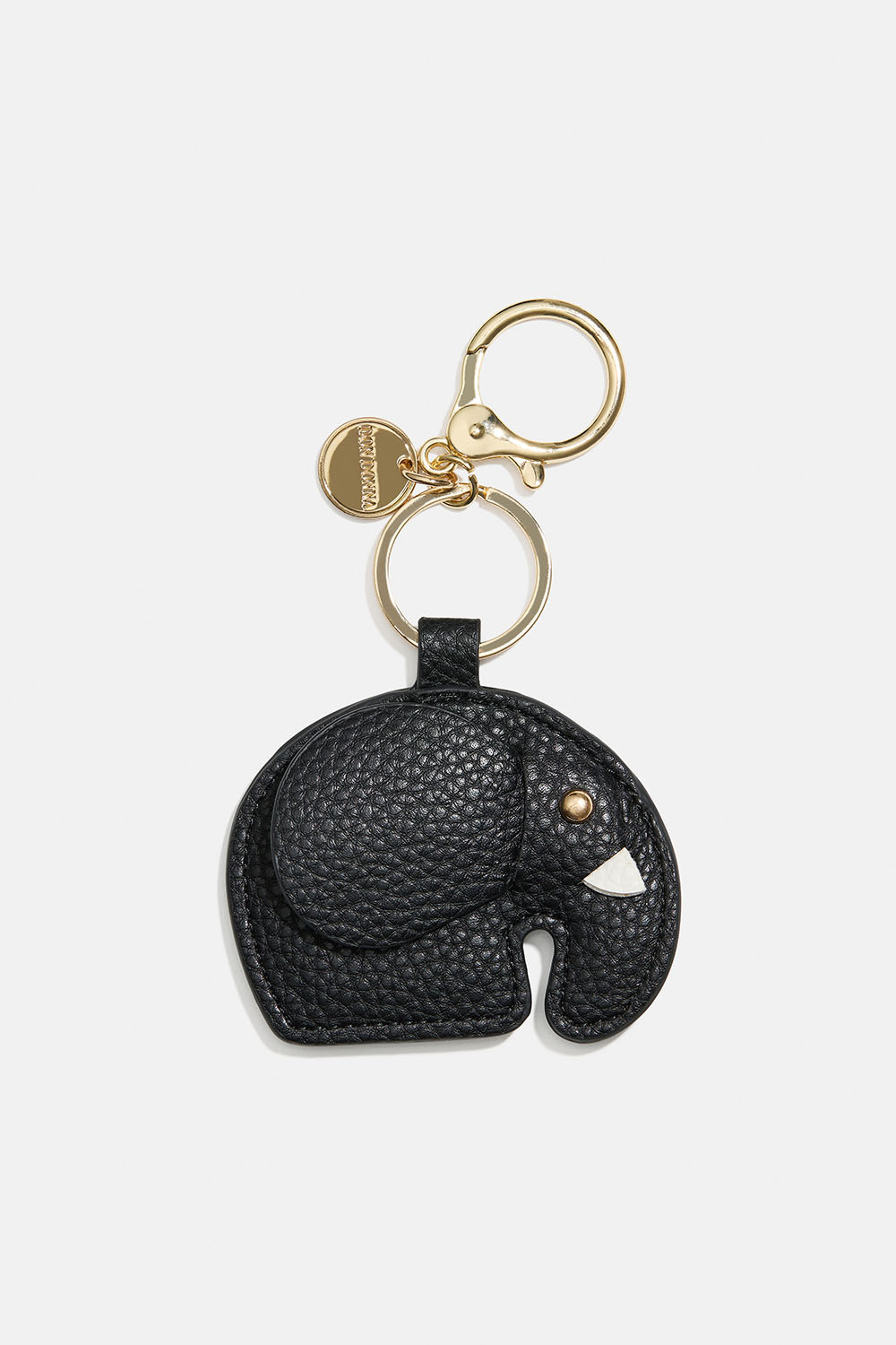 Nøglering med elefant i sort imiteret læder. Kan fastgøres med en nøglering og en karabinlås.