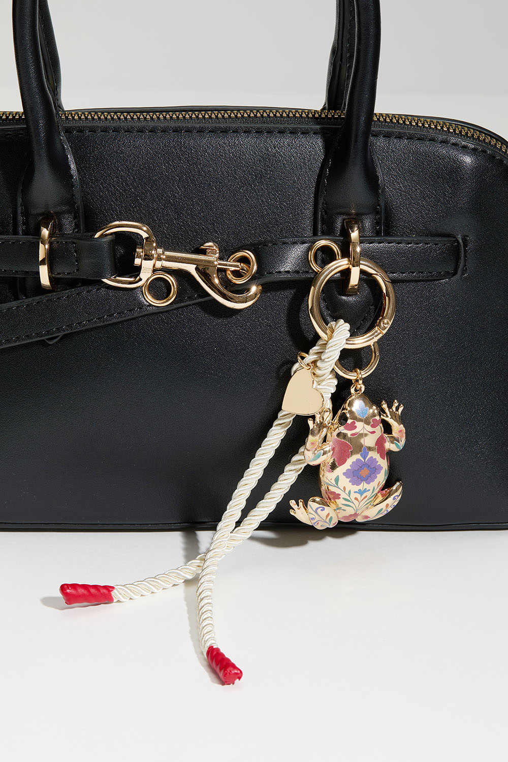 Taskepynt med hvid snoet snor og en guldfarvet frø i metal med dekorativt blomstermønster. Kan fastgøres med karabinlås.