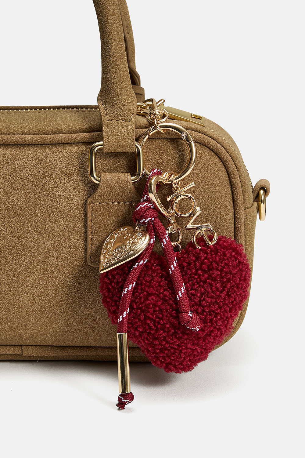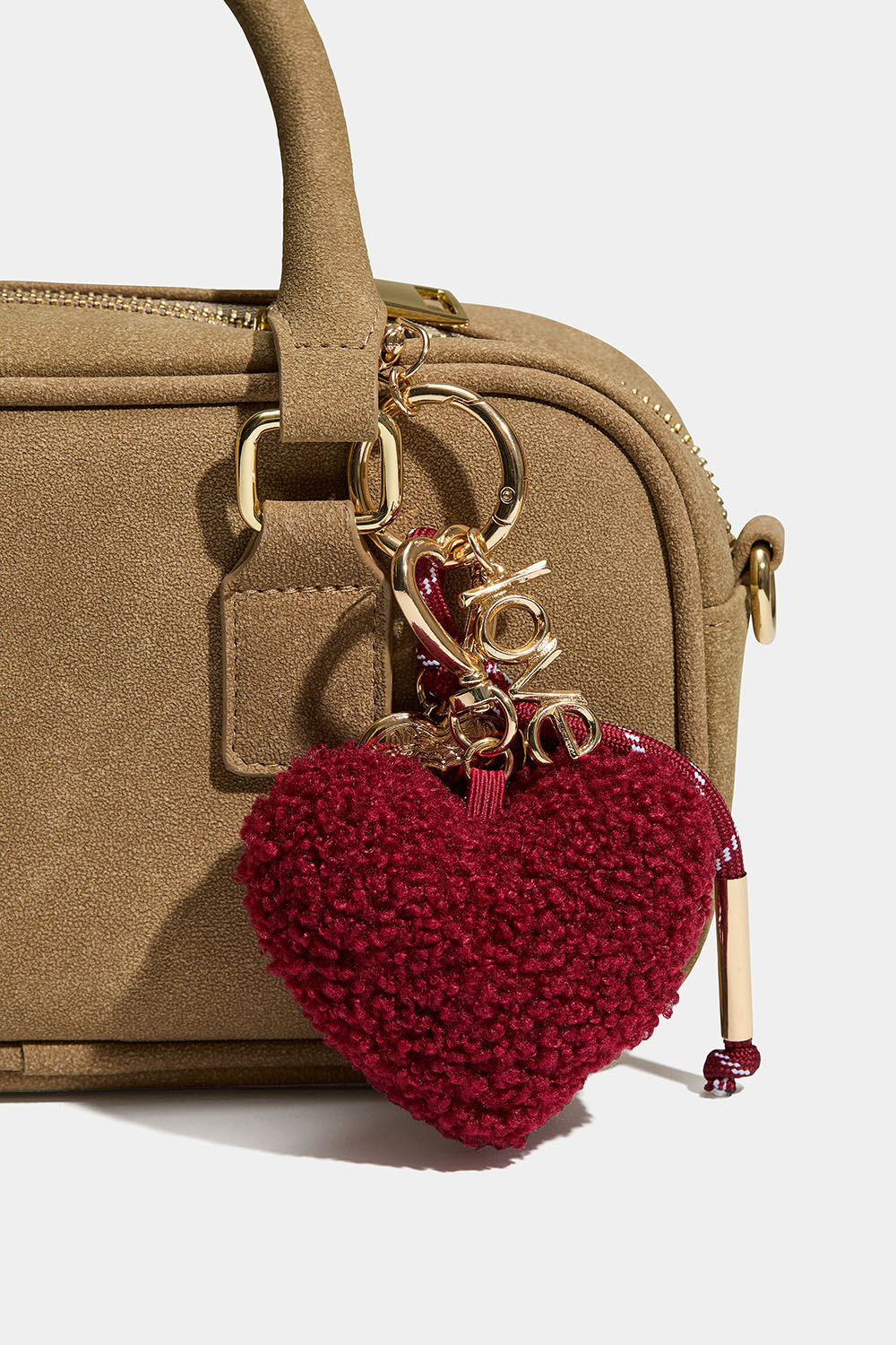 Nøglering med plysset mørkerødt hjerte, reb og vedhæng. Kan fastgøres med en nøglering og en karabinlås.