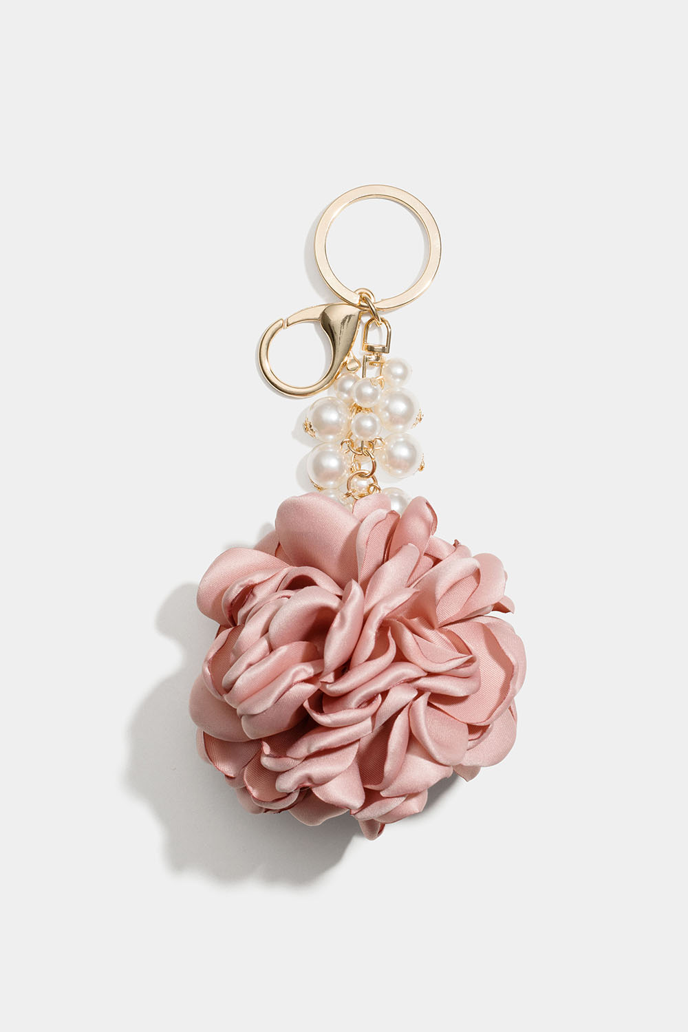Nøglering med hvide perler og stor rosa stofblomst. Kan fastgøres med en nøglering og en karabinlås.
