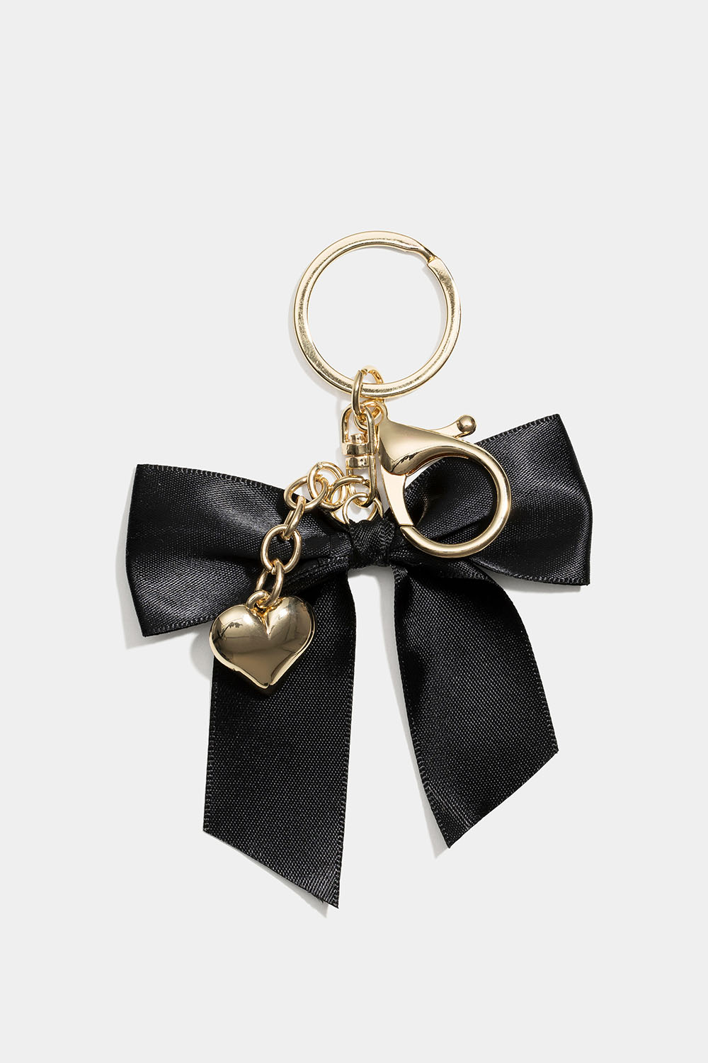 Nøglering med sort silkebåndssløjfe og guldfarvet hjerte i en kæde. Kan fastgøres med en nøglering og en karabinlås.