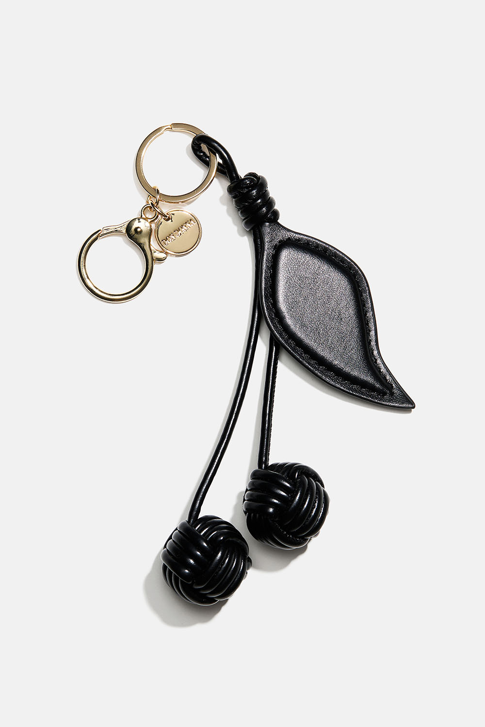 Nøglering med kirsebær i sort imiteret læder. Kan fastgøres med en nøglering og en karabinlås.