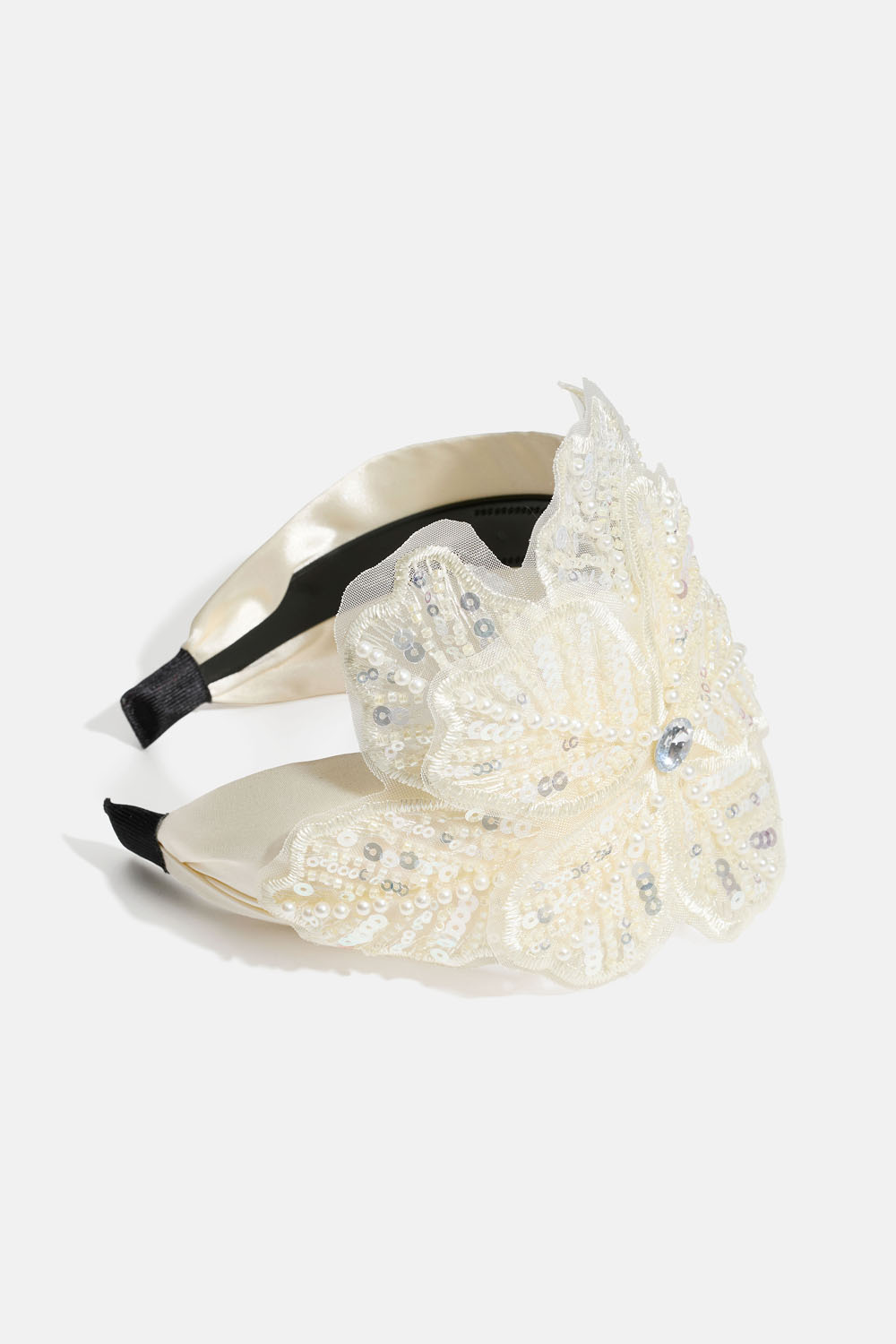 Bred tiara i hvidt, blankt stof med en stor blomst dekoreret med perler og pailletter.