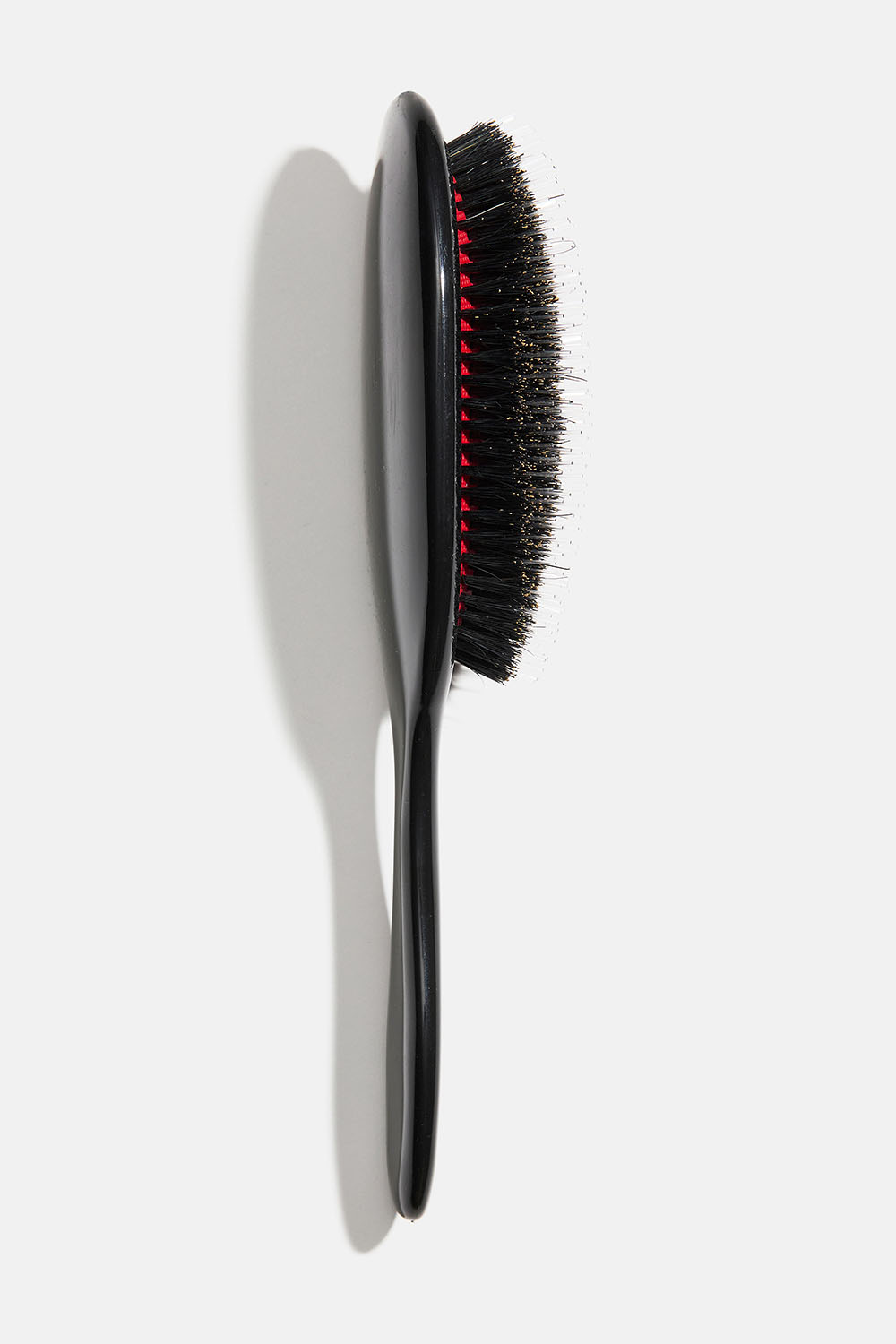 En hårbørste lavet af en blanding af ægte svinehår og nylonpigge med et sort skaft. Kan bruges til alle hårtyper. Må ikke bruges sammen med varme.