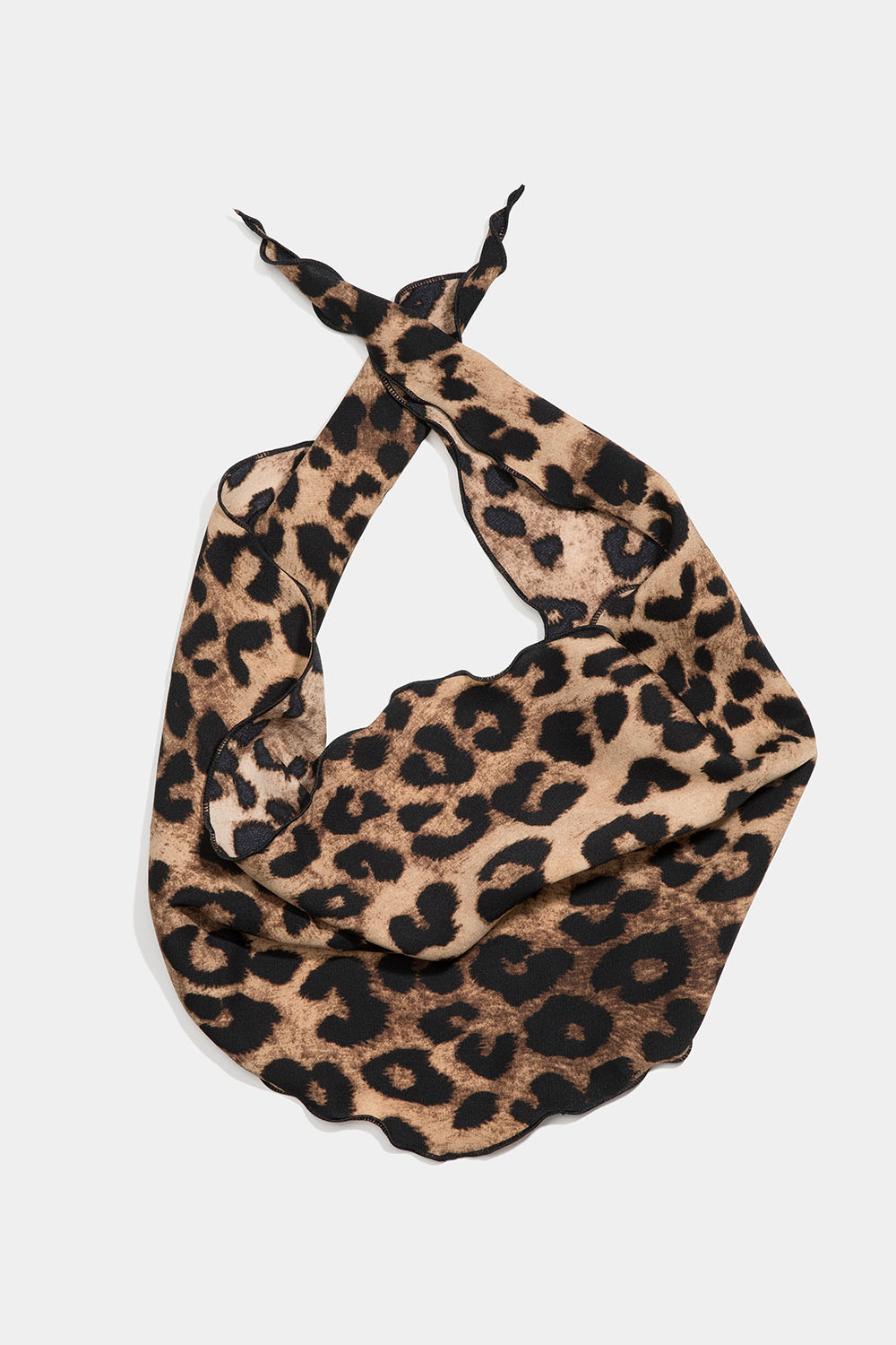 Rombeformet tørklæde med sorte syninger og brunt leopardprint. Kan også bruges som hårbånd