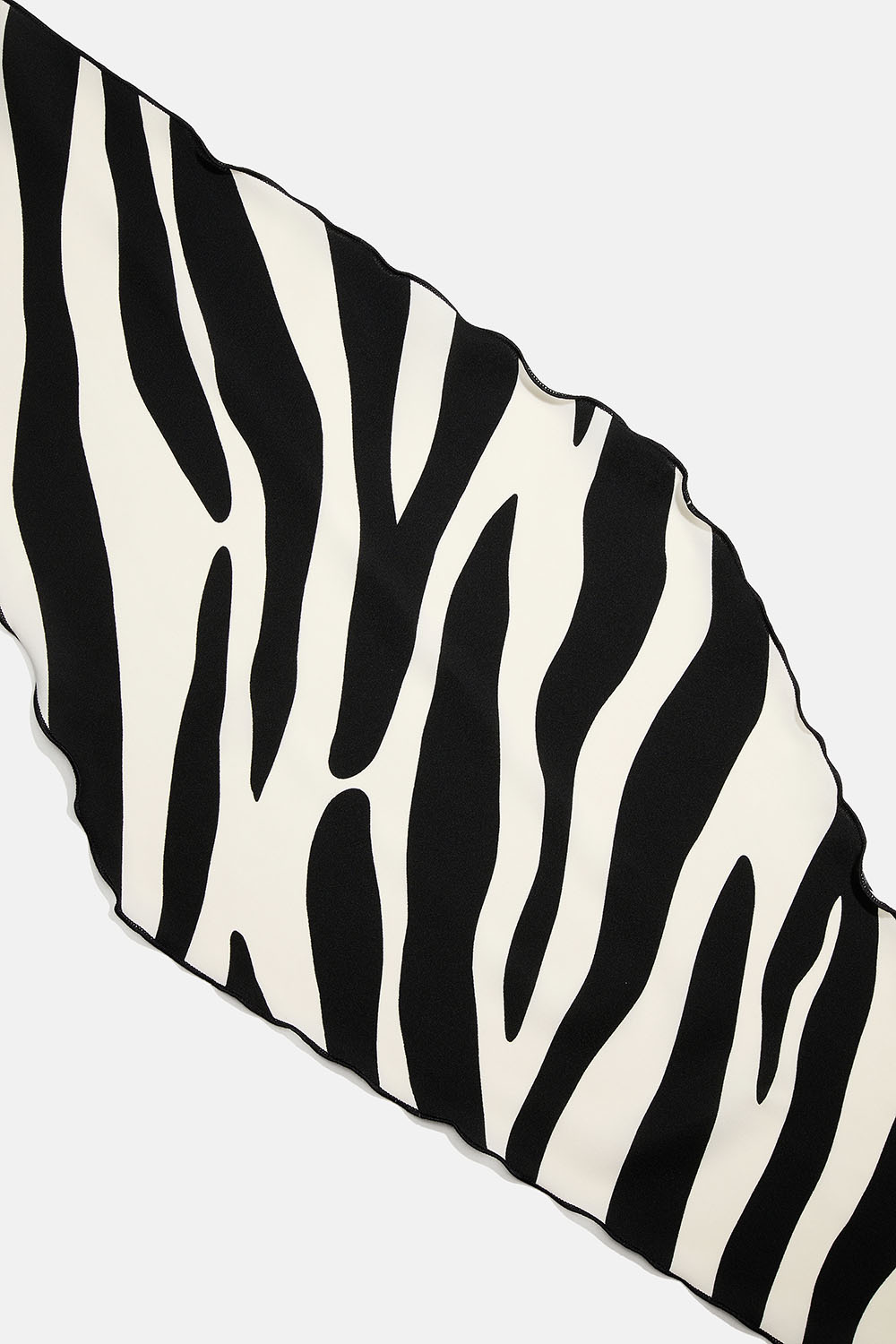 Rombeformet tørklæde med sorte syninger og zebramønster. Kan også bruges som hårbånd.